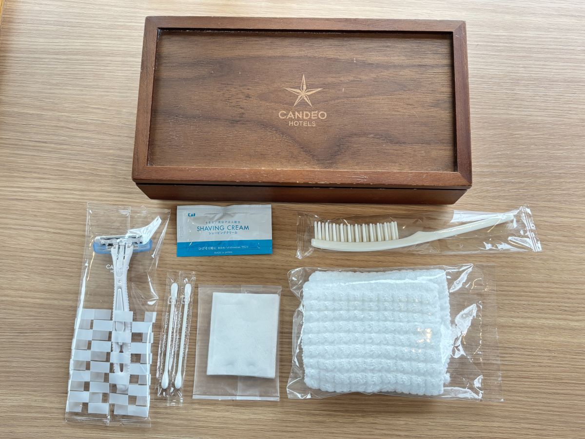 部屋にあるホテルのロゴが刻印されたウッドの箱にはブラシや綿棒、カミソリなどが用意されています。アメニティが充実していると手軽に旅行できるので、うれしいポイントです。