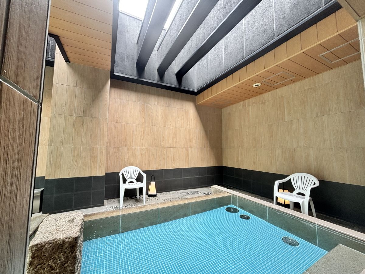 もうひとつの内風呂もチェック。広々とした浴槽なので、全身の力を抜いてリラックスできました。足元を照らすやさしい光の行燈が、和モダンな雰囲気をより盛り上げます。