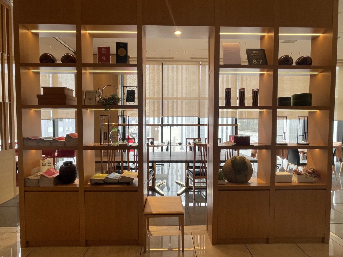 エレベーターで11階まで上がると、木箱やつぼなど日本らしい調度品が飾られた美しい棚と、奥には新橋の街並みが広がっています。「CANDEO HOTELS 東京新橋」のコンセプトの一つが和モダンなので、ラグジュアリーな雰囲気と日本らしさを融合させたデザインにこだわっているそう。