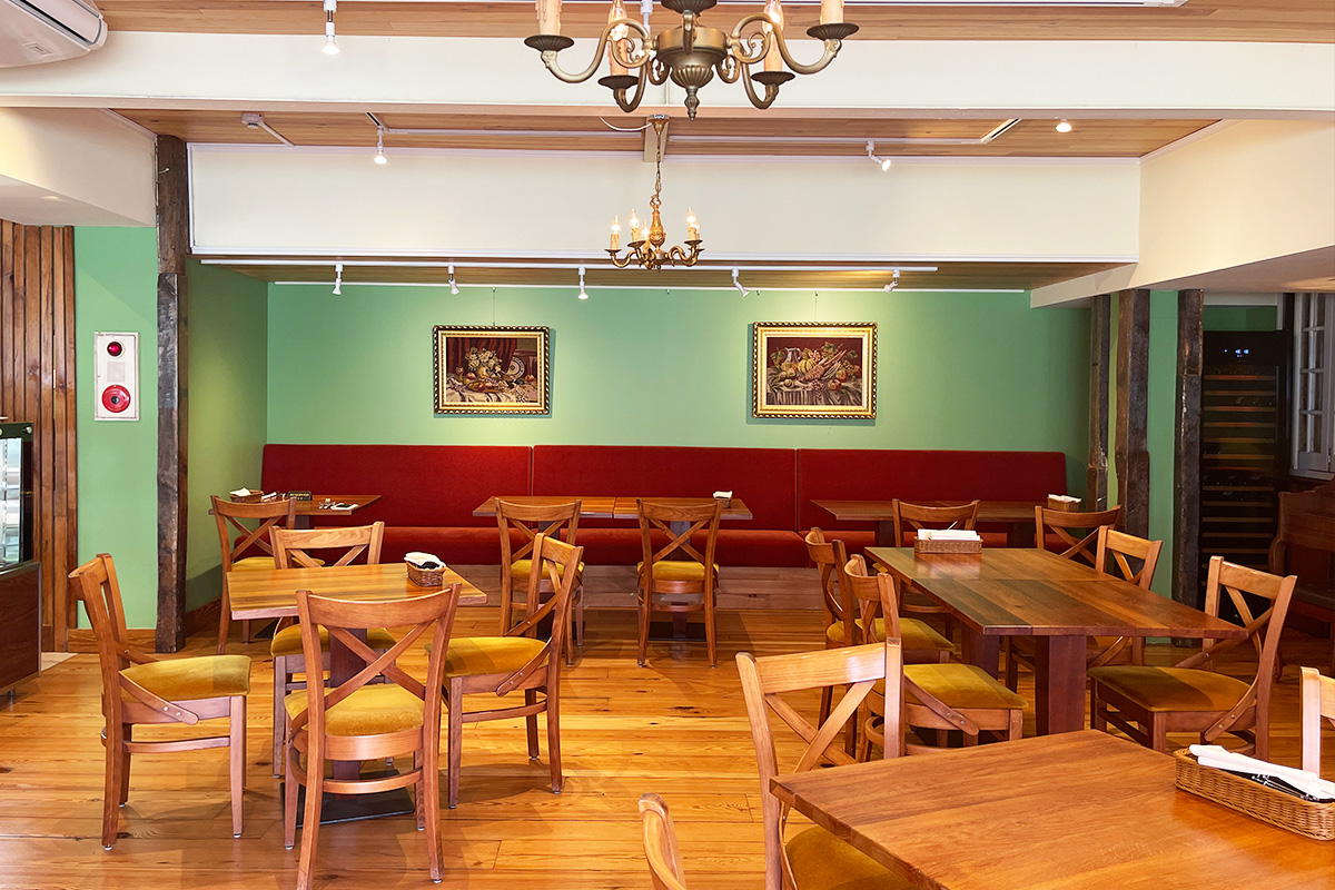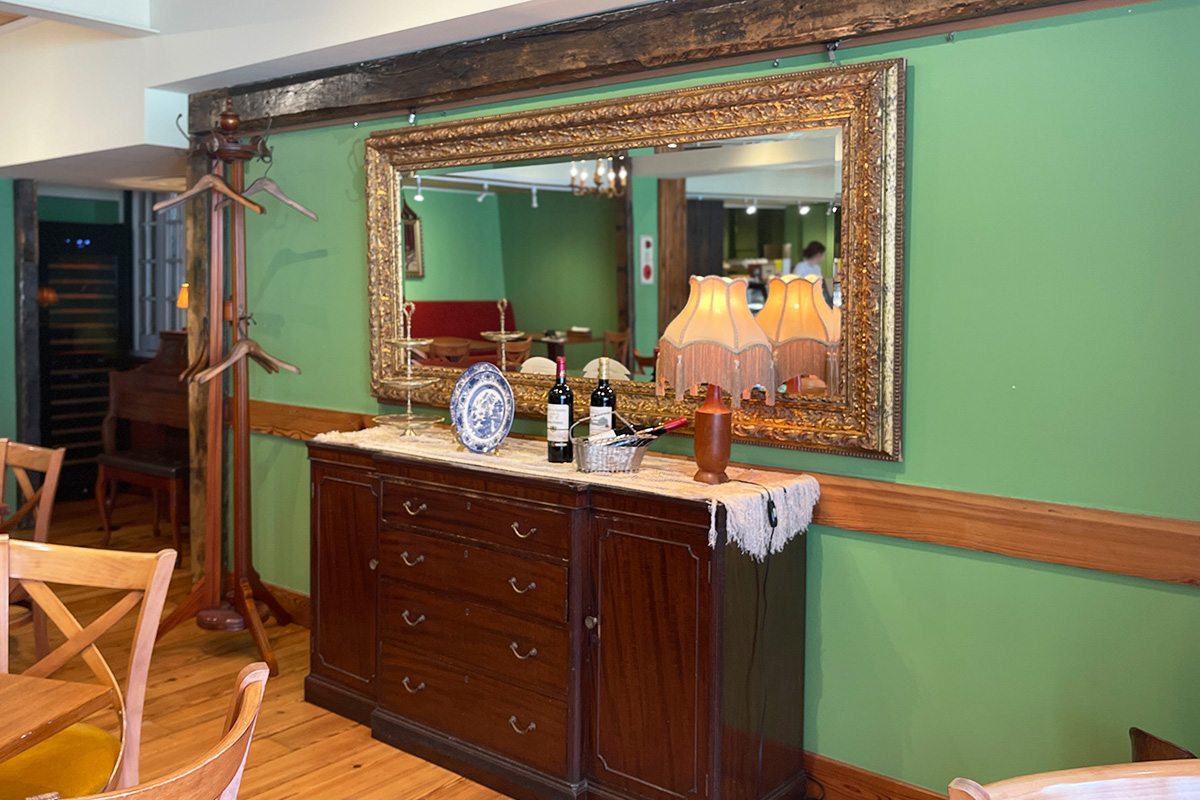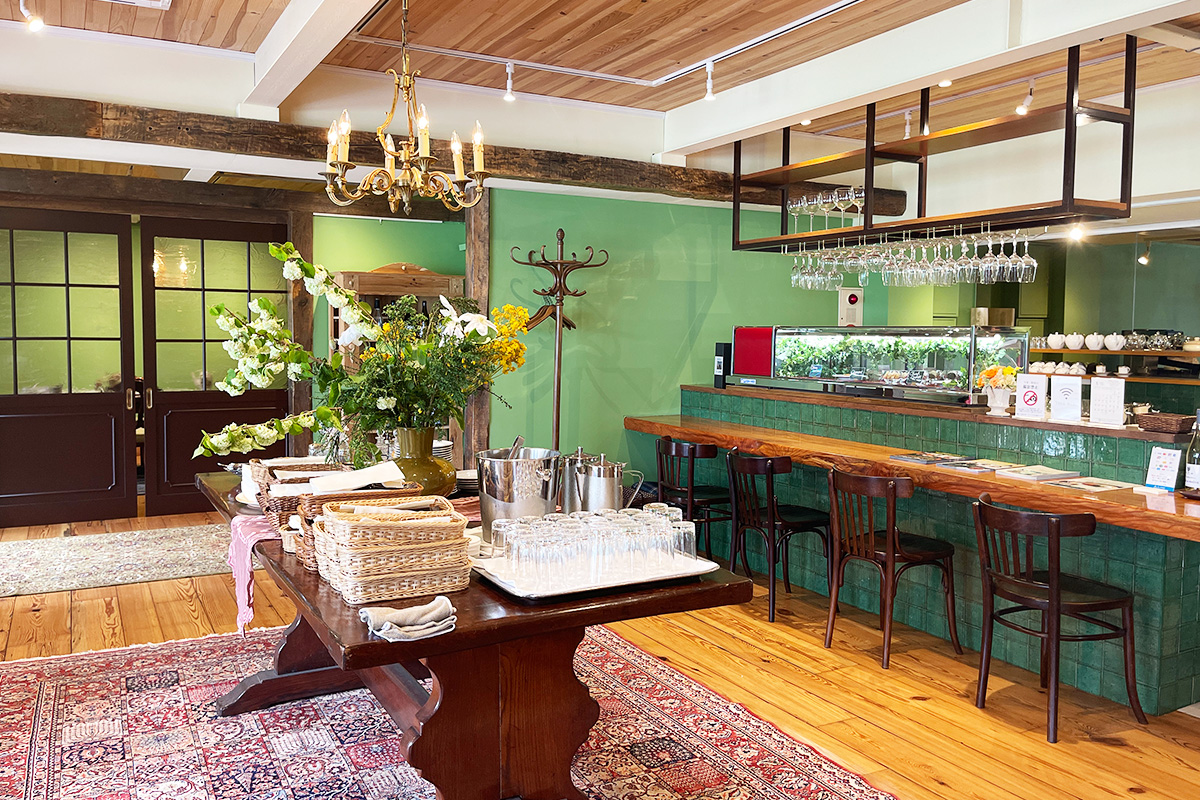 グリーンの壁紙や、レッドのソファーなど鮮やかな色使いが目を引く店内。天井には、アンティーク調のシャンデリアが輝いていました。木目のテーブルやチェストが温かみを演出し、華やかでありながらも肩の力を抜いて過ごせる空間です。