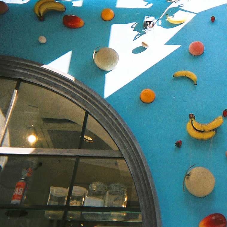 ロータリー側の改札を出て、とりあえず右へてくてく…。フルーツいっぱいのキュートな壁を見つけました。