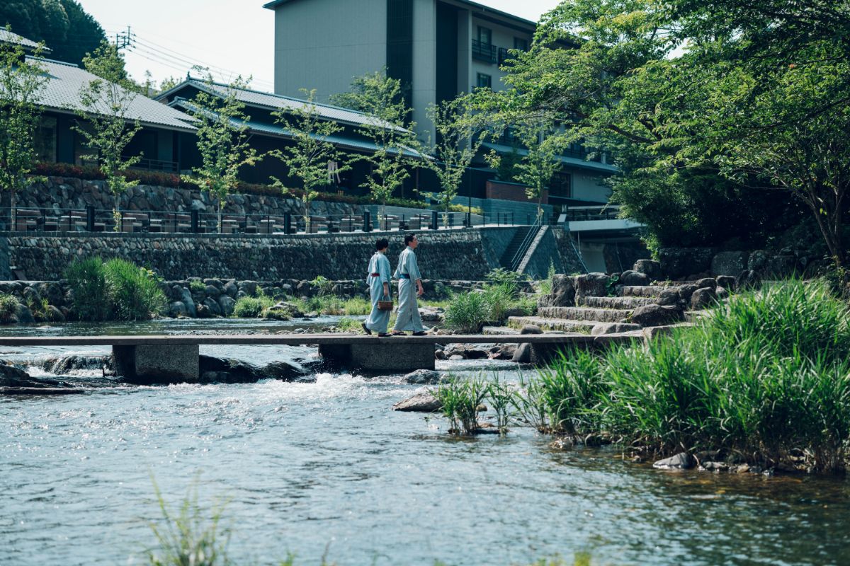そんな温泉街の一角に立つ「界 長門」に併設する「あけぼのカフェ」では、2025年4月1日から、川のそよ風や木漏れ日などの都会では感じられない自然の豊かさを感じながら、穏やかな時間を過ごすことができる「どらやき茶かご ~ 季 (とき) の野点 ~」を提供中。