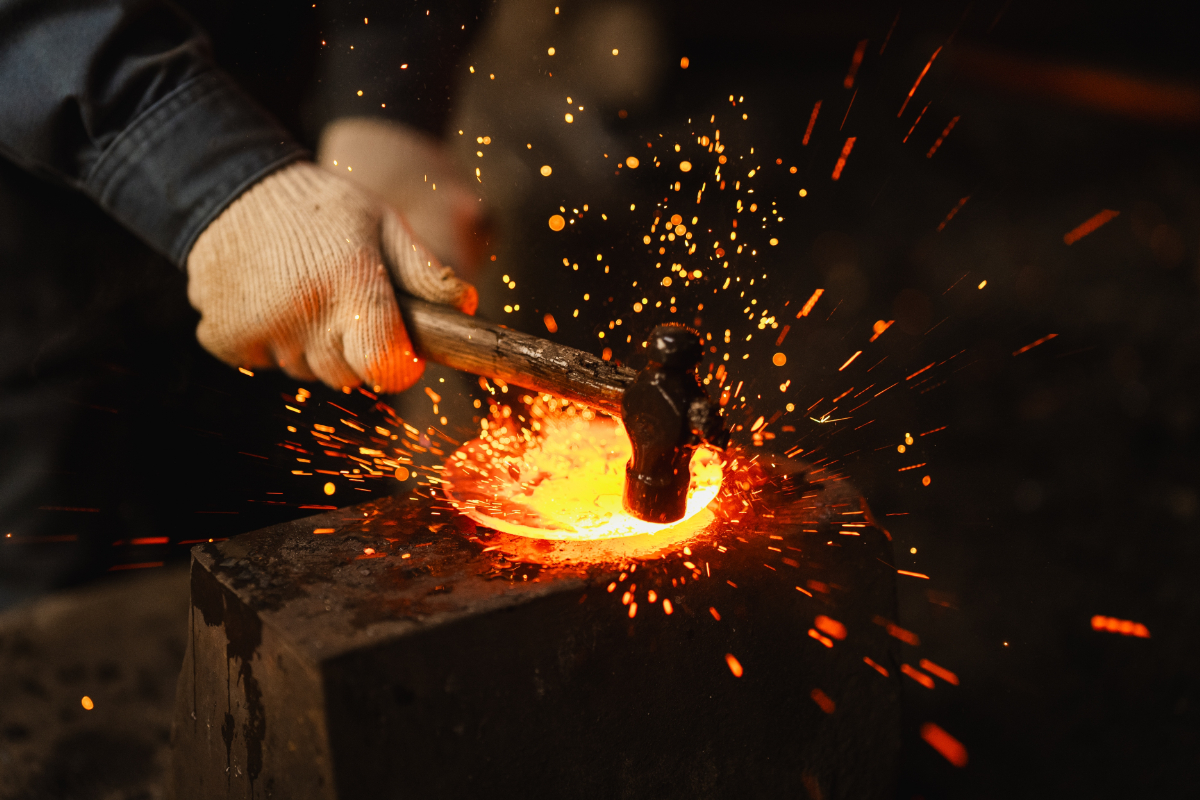 プログラムではさまざまな角度からたたら製鉄を楽しめるのですが、まずは江戸時代より代々鍛冶業を営んできた鍛治職人の指導のもと、鉄を打つ「鍛造」を体験します。