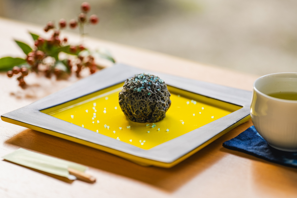 「出雲のたたらと出会う」プログラムでは、その玉鋼をイメージし、見た目だけでなく、鉄の硬さを意識したシャリシャリした食感の和菓子を提供。日本三大和菓子処といわれる松江の和菓子職人が開発した「界 玉造」オリジナルスイーツ。ぜひゆっくりと味わってみてくださいね。