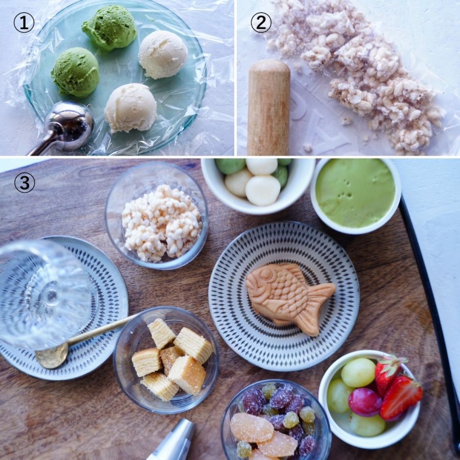 | (2色の白玉だんご) ✓白玉粉…100g ✓絹ごし豆腐…150g ★抹茶…小さじ1/2 ★上白糖…小さじ1/2 (組み立て) ✓バニラアイスクリーム、抹茶アイスクリーム…各1個 ✓粟おこし(市販)…2個 ✓ホイップクリーム…適量 ✓抹茶プリン(市販)…1個 ✓バウムクーヘン(市販)…適量 ✓甘納豆…適量 ✓イチゴ、ブドウなどお好きなフルーツ…適量 ✓抹茶…適量 ✓ミニたい焼き(市販)…1個 |