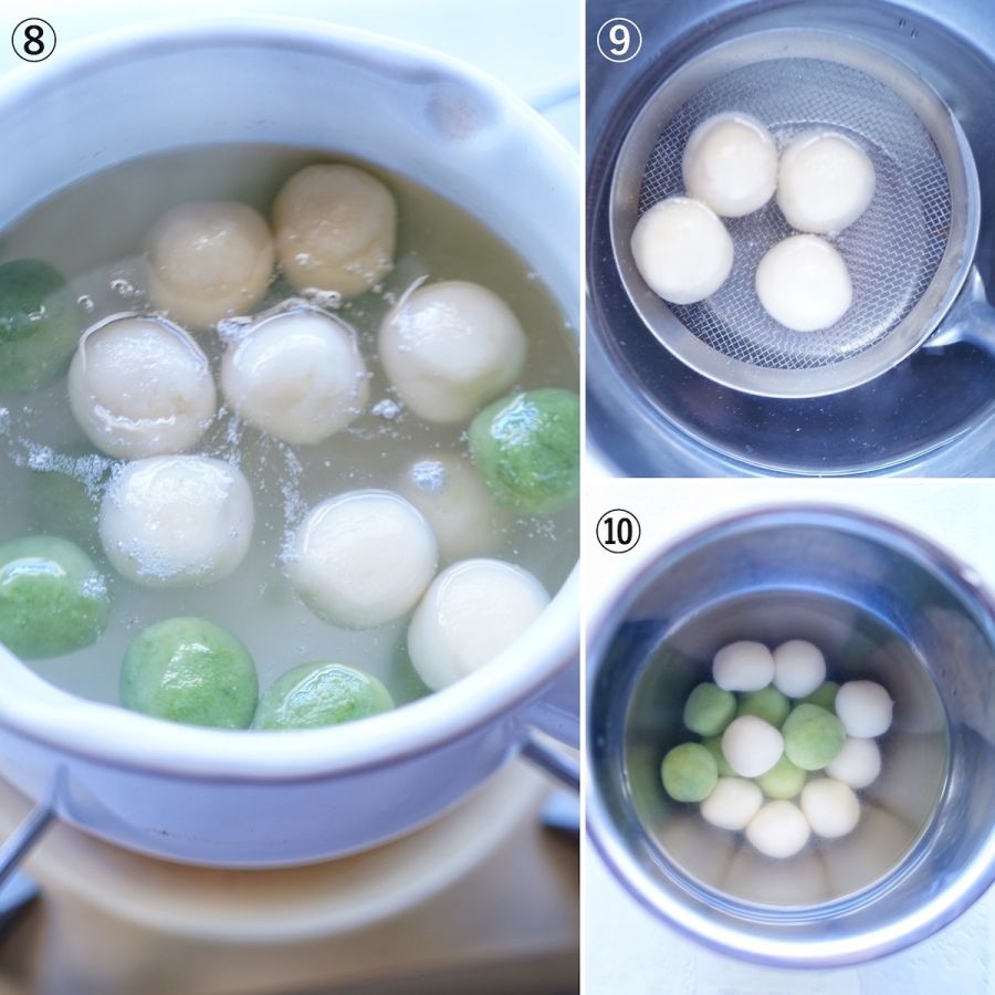 8. 沸騰したお湯に、2cm程度に丸めた7をやさしく入れ、浮き上がってくるまで茹でます。
