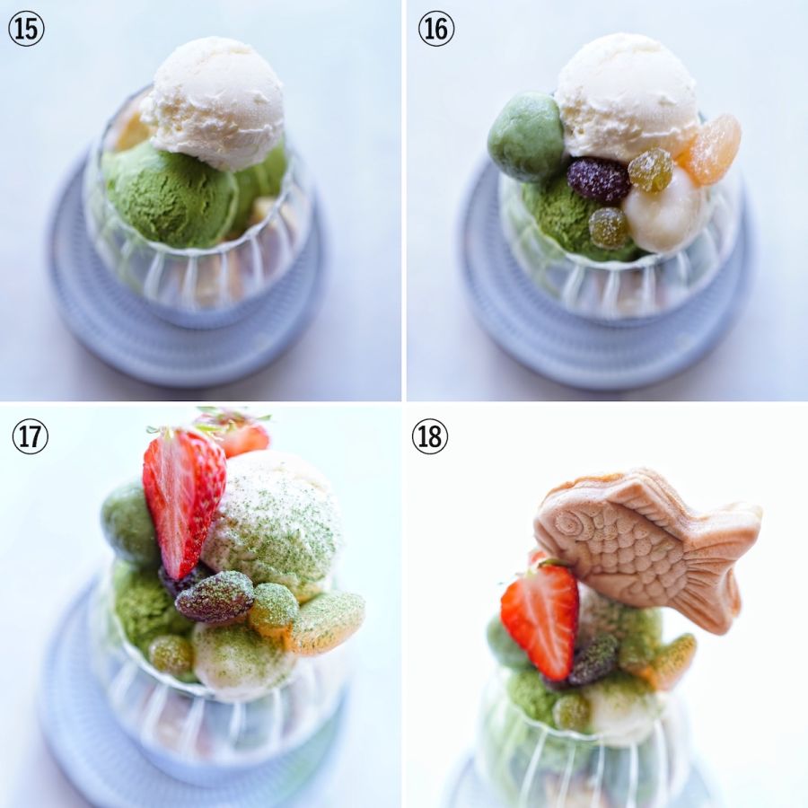 17. お好きなフルーツと甘納豆を飾り、茶こしで抹茶を振ります。