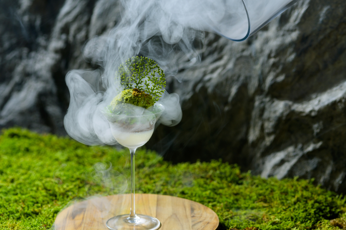 パフェをただ味わうだけでなく、夏の苔の生息環境を楽しんでほしいという想いから、幻想的なスモークを用いて、太平洋高気圧から吹き込む、冷たく湿った北東風“ヤマセ”を再現して提供しています。