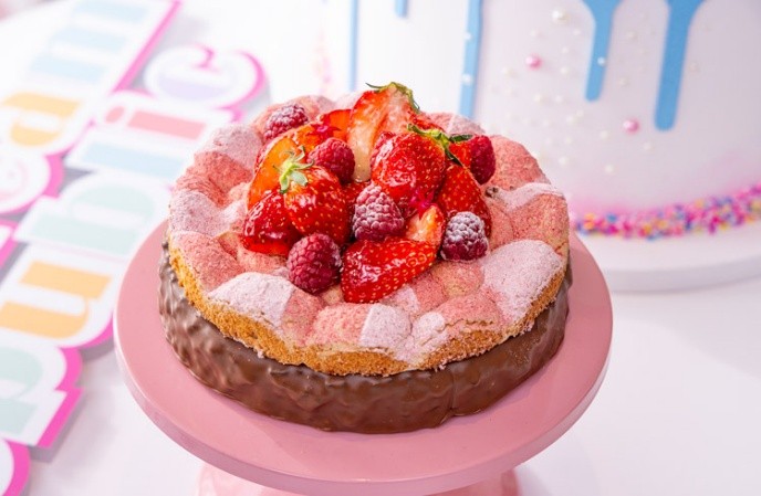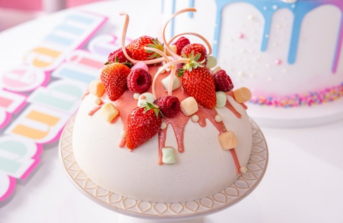 大きなフルーツのトッピングが可愛らしいドーム型スイーツ。なめらかなバニラムースの中に酸味の効いたラズベリーゼリーがアクセントになり、見た目以上にさっぱりとした食べやすい甘さです。