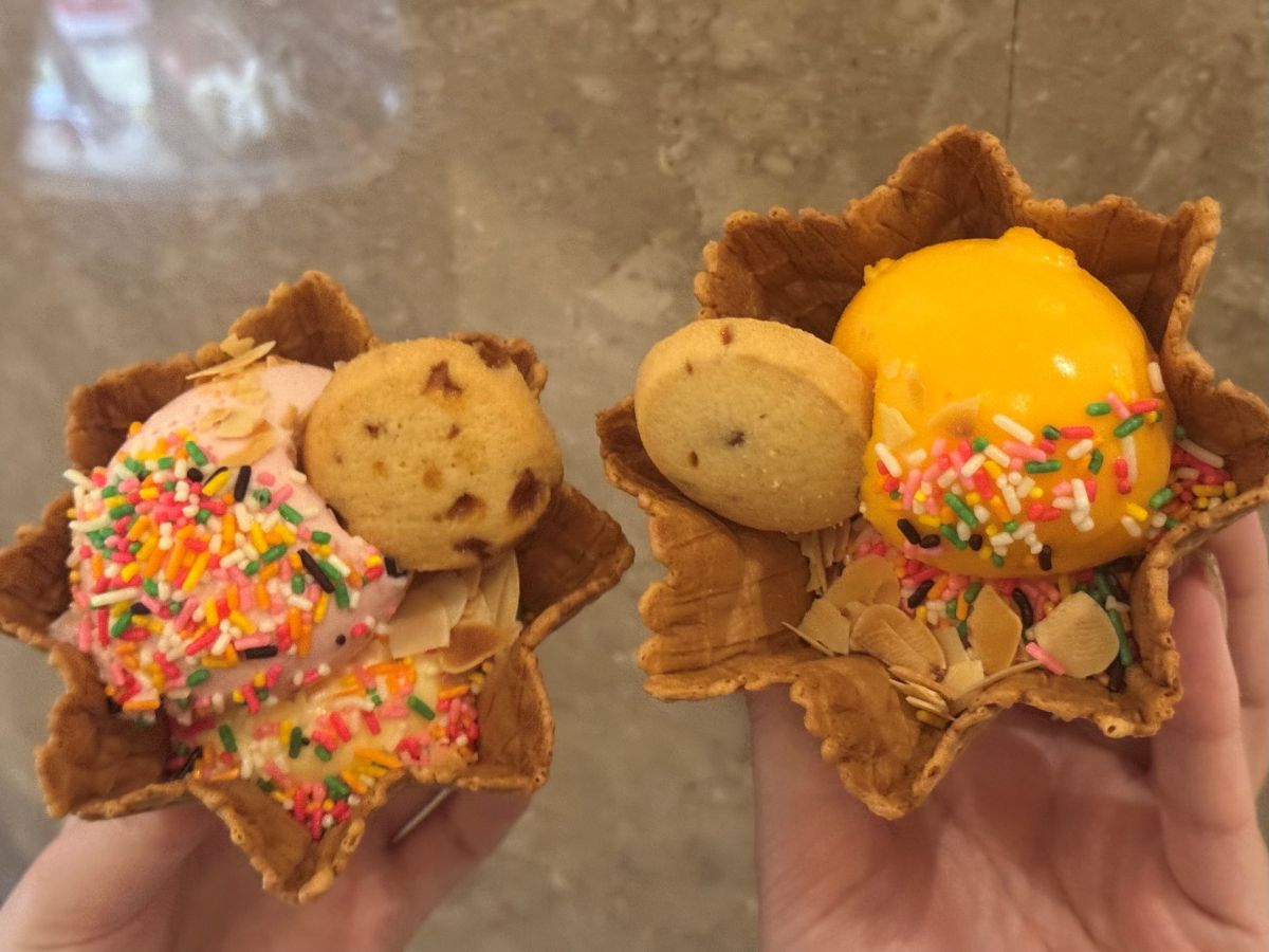 まずはコーン選びからスタート! 星形のコーンと定番のワッフルコーンから選択可能。星形コーンはトッピングをたくさんのせて上からとれば写真映え間違いなし。今回はいちご&バニラ(写真左)、いちご&マンゴー(写真右)味をセレクト! トッピングしがいがあります♪