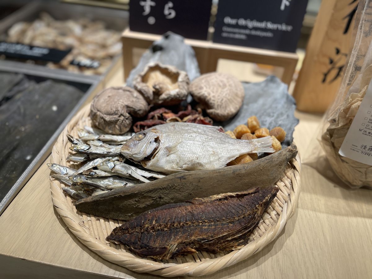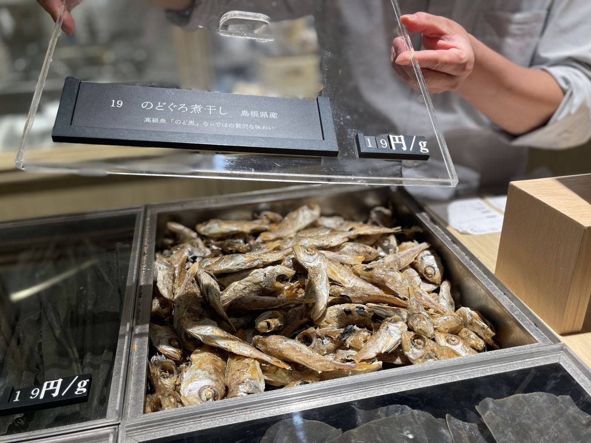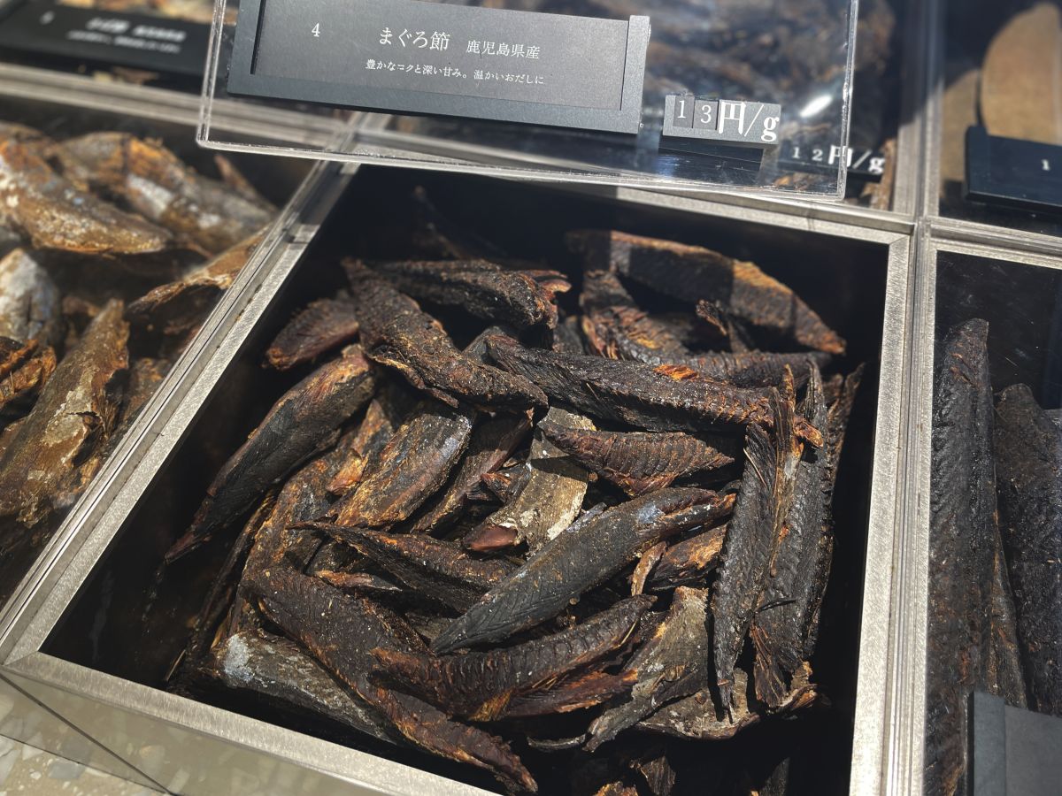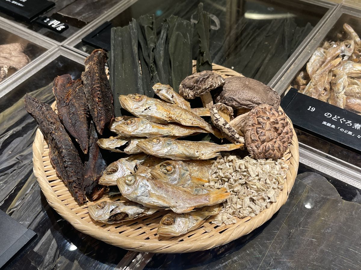 気になる原料はショーケースのふたを開けて煽いでもらい、香りを確かめてみることもできます。例えば同じ「節類」「煮干し」「昆布」のなかでも、種類によって香りもその強さも全然違って驚き!
