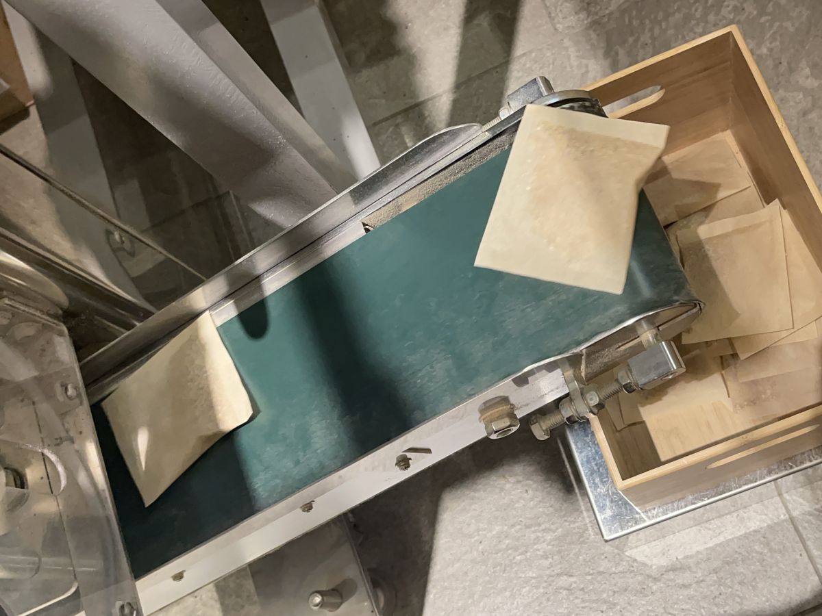 粉末状になっただし原料は、ベルトコンベアでパッキングされて出てきます。一つずつ流れてくる様子を見ているだけで、これからだしパックを使うワクワク感がさらにアップ!