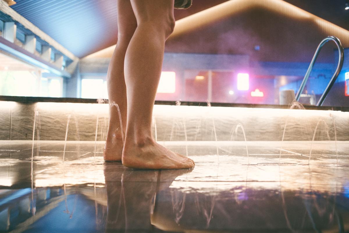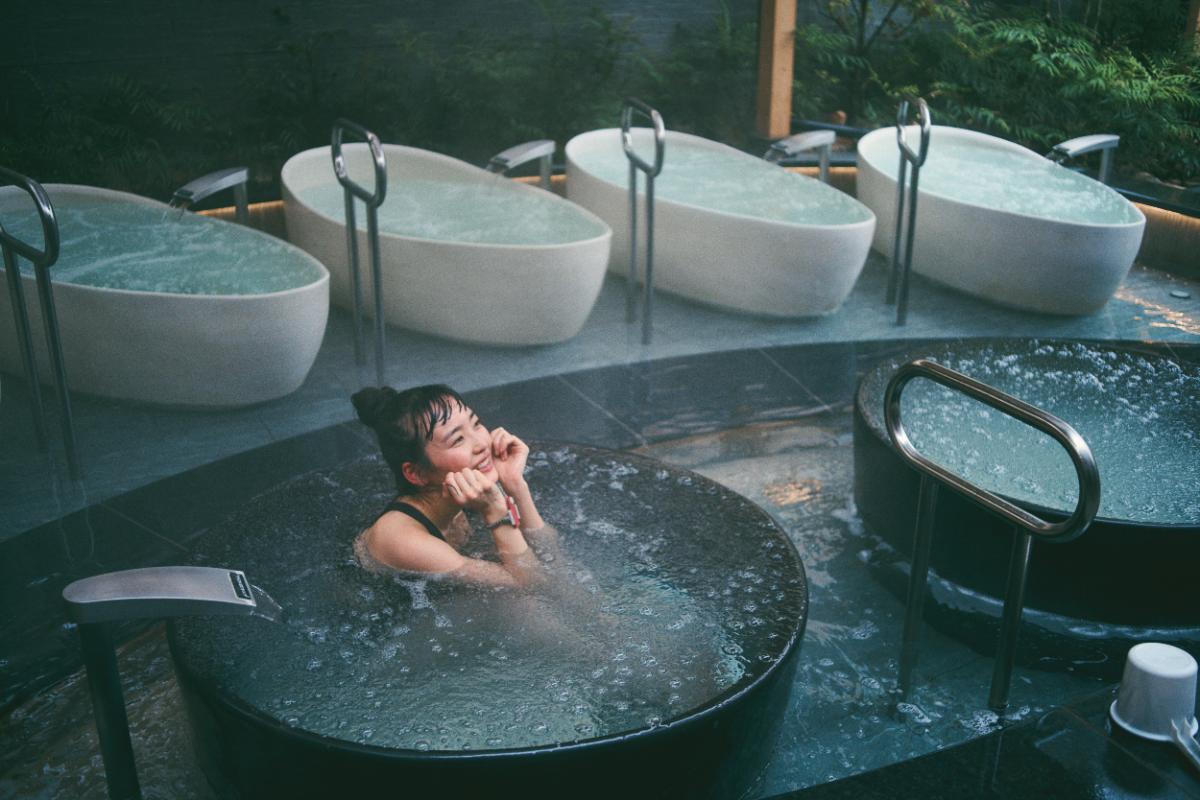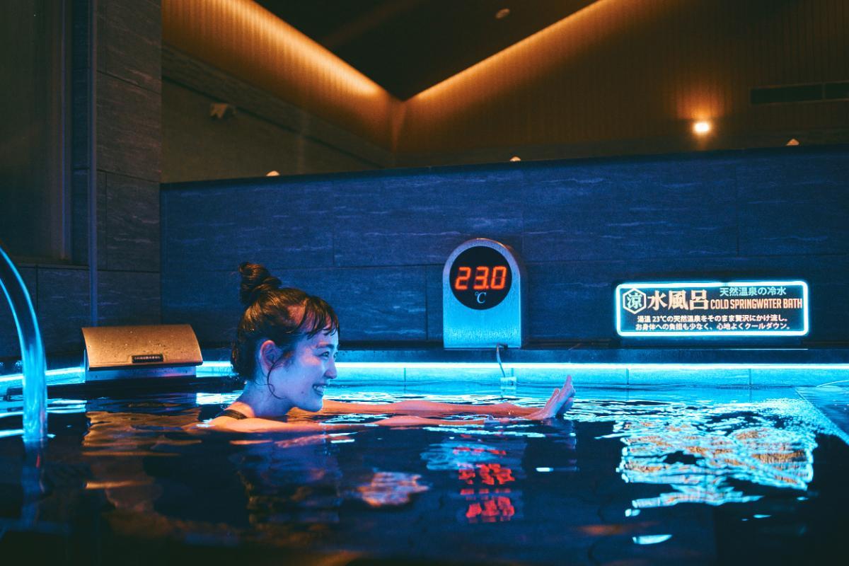 天然温泉をかけ流しした、水温23℃不感水風呂。やさしく包み込まれてこのままととのいそう。