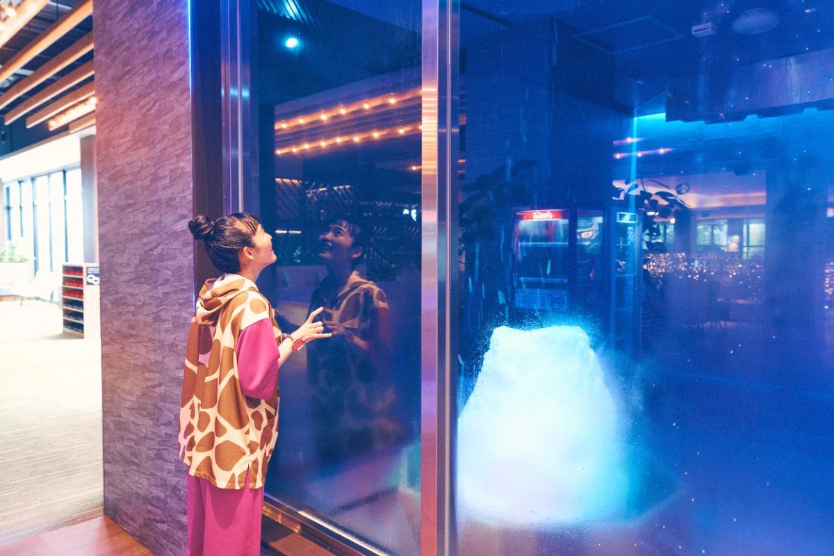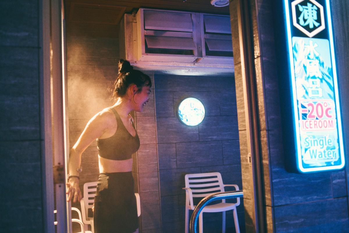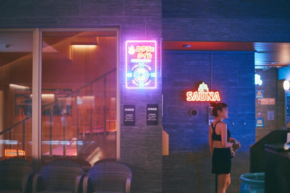 早速、ネオンが輝くサウナ「富士山溶岩ロウリュサウナ」へ。