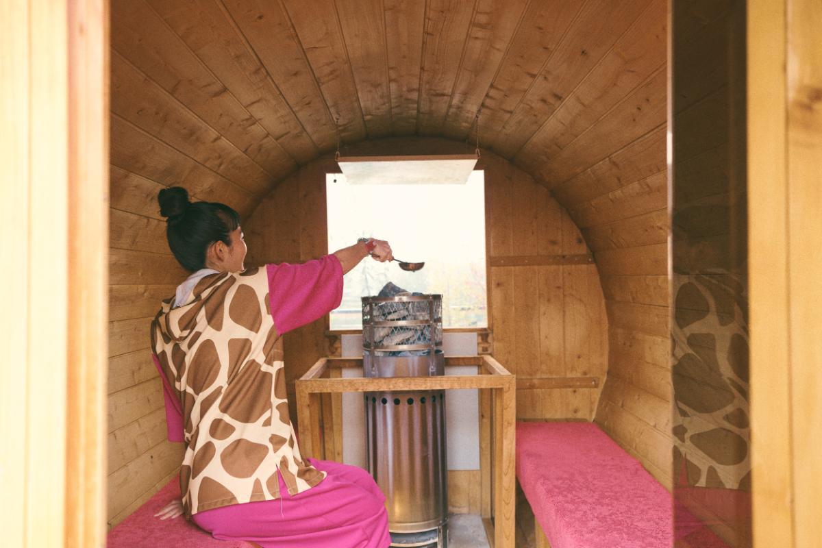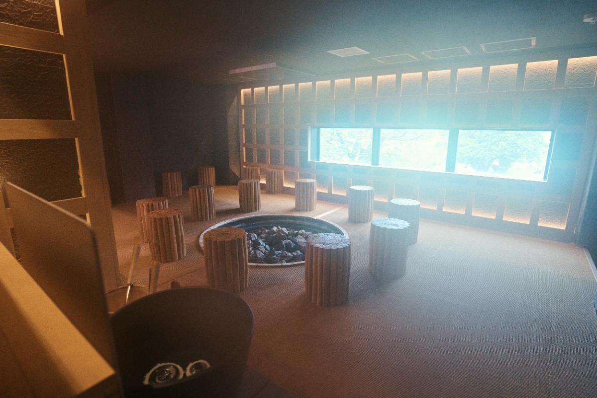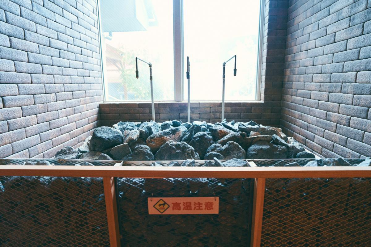 薪ストーブと、囲炉裏を模したこの丸いストーブは、ロウリュが可能。わたしが知っている岩盤浴の概念が覆る熱さを兼ね備え、あっという間に滝のように汗をかきました。