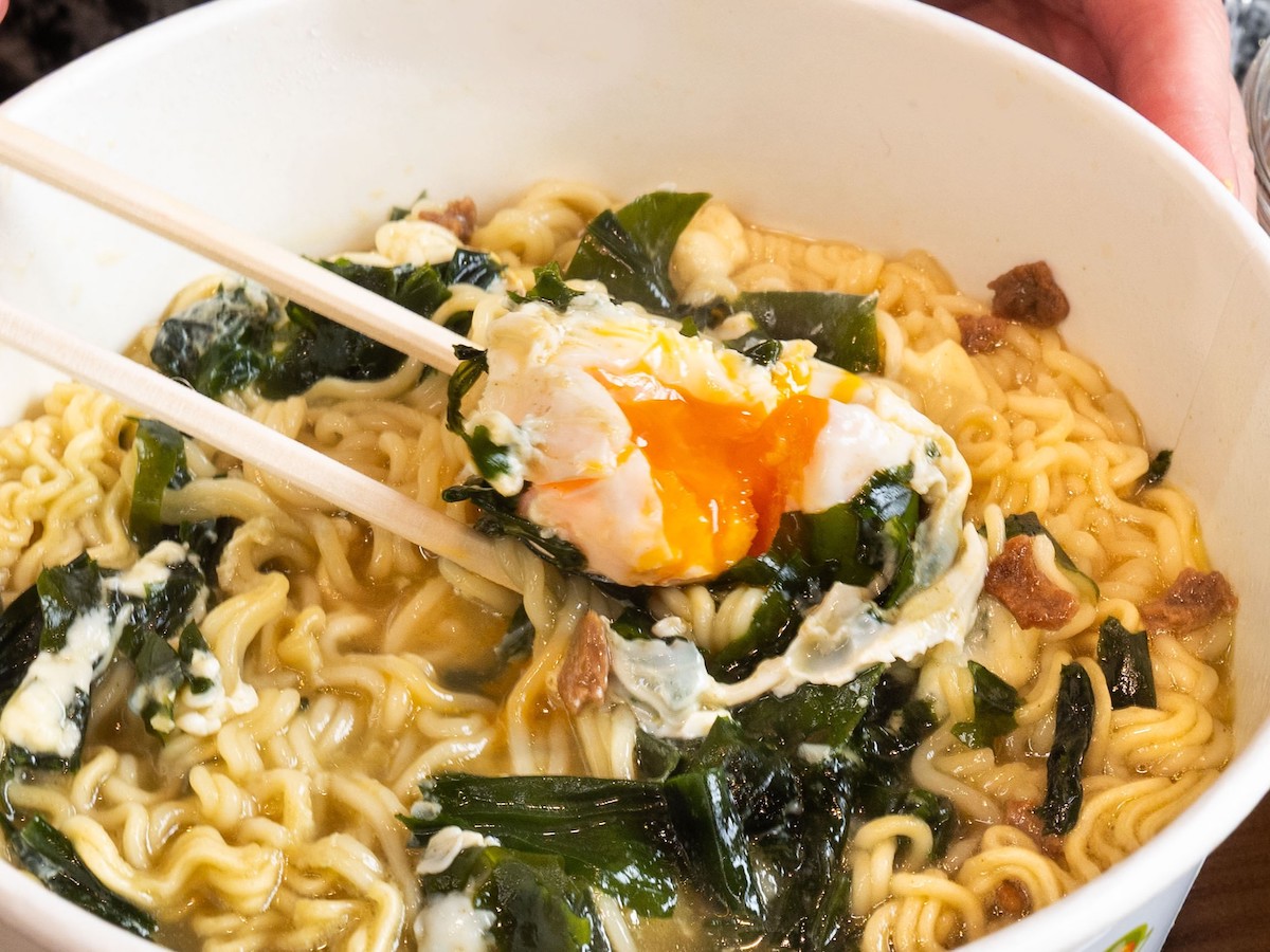 うれしいことに生卵とチーズは無料サービス♪ ラーメンカップ1杯につき各1個を使うことができます。今回私は炒め麺だったため完成後にのせましたが、スープがあるラーメンの場合は、麺をほぐしたあと早めに入れるのがおすすめですよ!