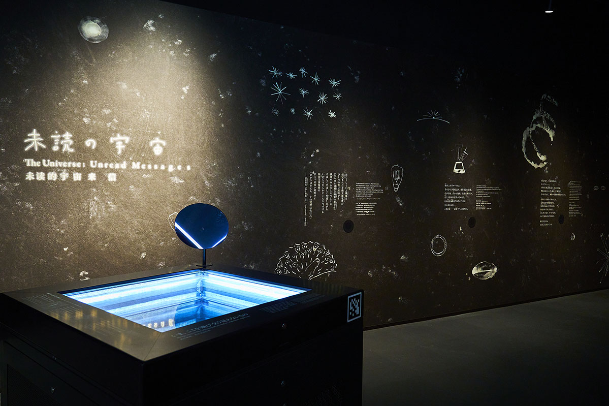 私たちの周囲を飛び交う見えない粒子を可視化する「霧箱」があり、壁面には宮沢賢治の「春と修羅・序」の一節、日常と物質・天体・宇宙との関係を語る詩やイラストがちりばめられています。壁面から聞こえる朗読は、俳優の池松壮亮さん、モデル・歌手の甲田益也子さんが担当しています。