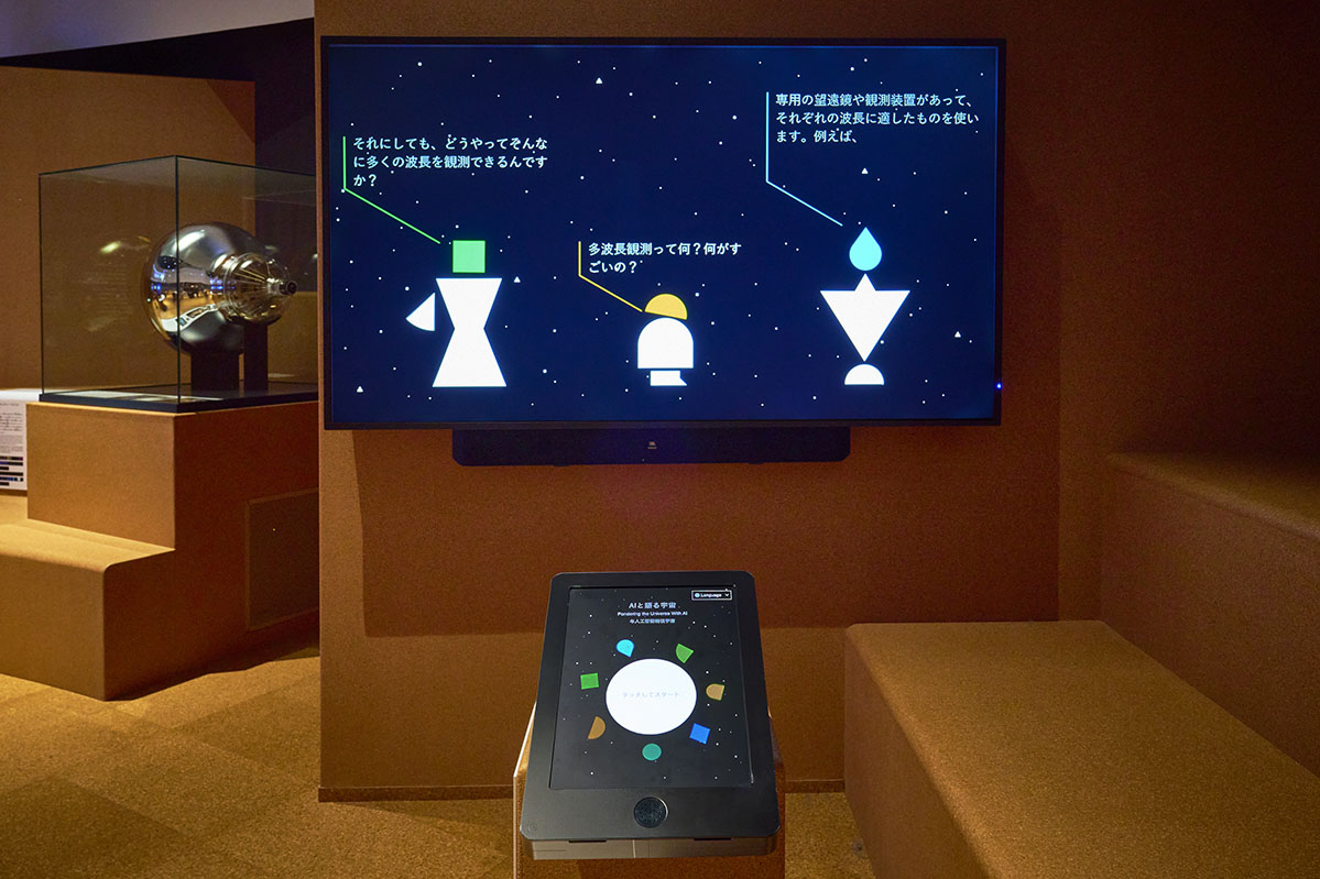 4つの体験装置それぞれには、本展示の監修を務める第一線の研究者が、スマートフォンのビデオ通話風の映像として登場しています。その映像と体験装置が連動しているので、まるで研究者と通話しながら、一緒に宇宙の観測や実験をしているかのような体験ができるんです。なかなか研究者と話す機会はないので、こうやって研究者と一緒に観測や実験ができる感覚になれるって、新しい!