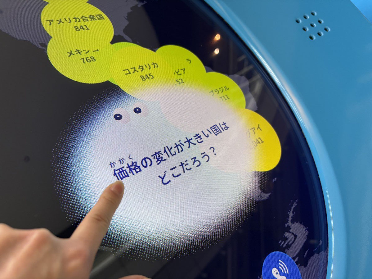 そもそも、「ジオ・スコープ」は、世界の研究機関などから提供された科学データを来館者が自由に閲覧できる常設展示として、2011年に公開されたもの。生物の生態の季節変化や気候変動、地球環境の未来予測などの多彩なデータから地球規模の変化を直感的に理解することができる展示です。今回のリニューアルで、「世界の電力消費量」や大気中の「エアロゾルの濃度」などの8つの最新データを新規収録。これまでのジオ・スコープから厳選されたデータと合わせて、計20の地球に関するデータにアクセス可能。直感的な操作性を高めるデザインに変更され、地球をのぞき込む望遠鏡をイメージした形に変わっています。5台設置された端末のうち1台は、科学データを音でも表現した「耳で楽しむモード」も搭載されています。