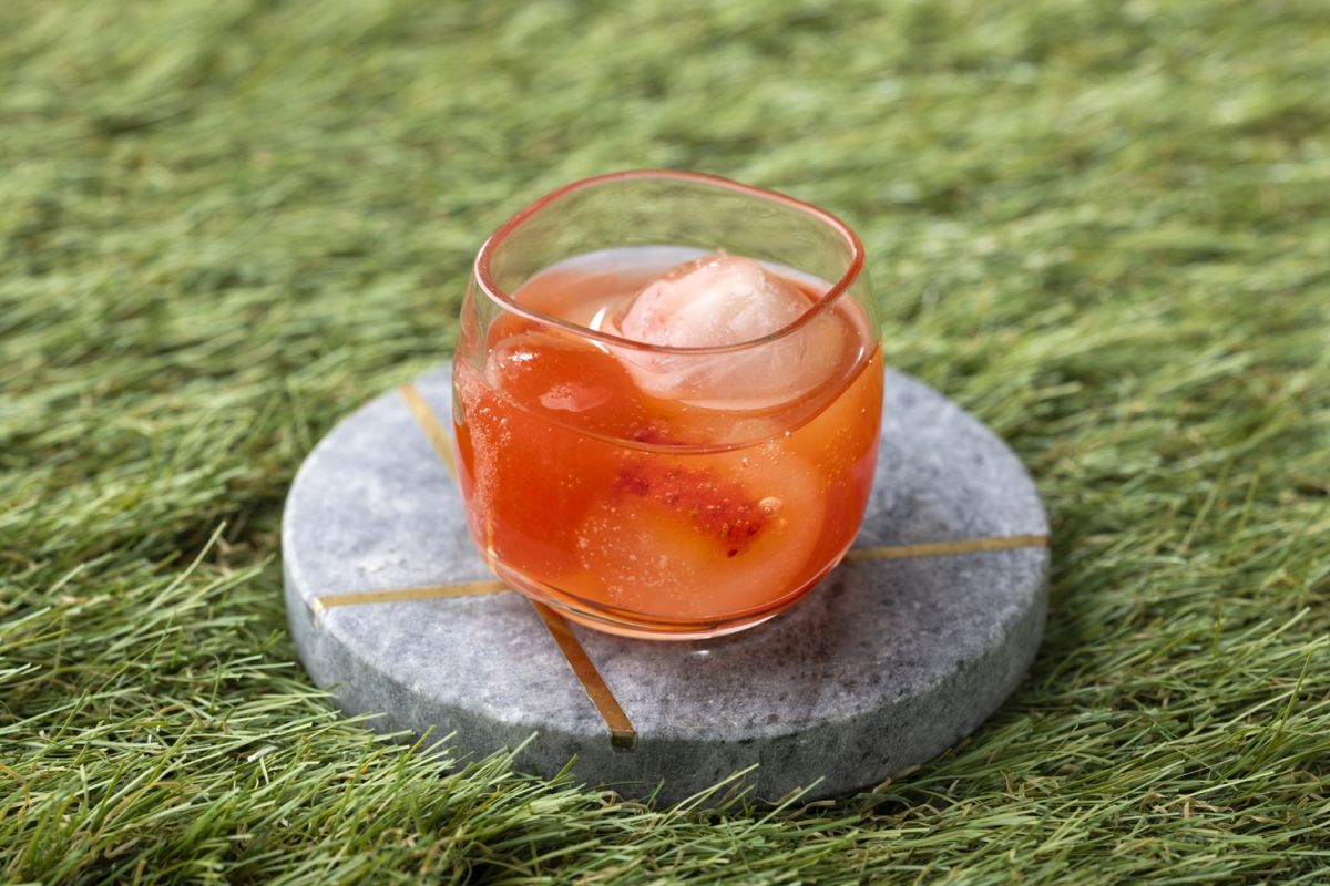 ライチソーダに、イチゴジュレとイチゴ果肉入りライチジュレを浮かべた、さわやかでみずみずしい一品です。