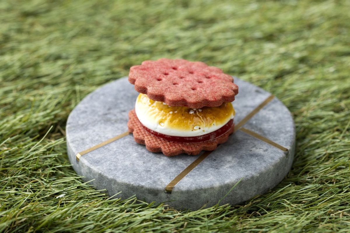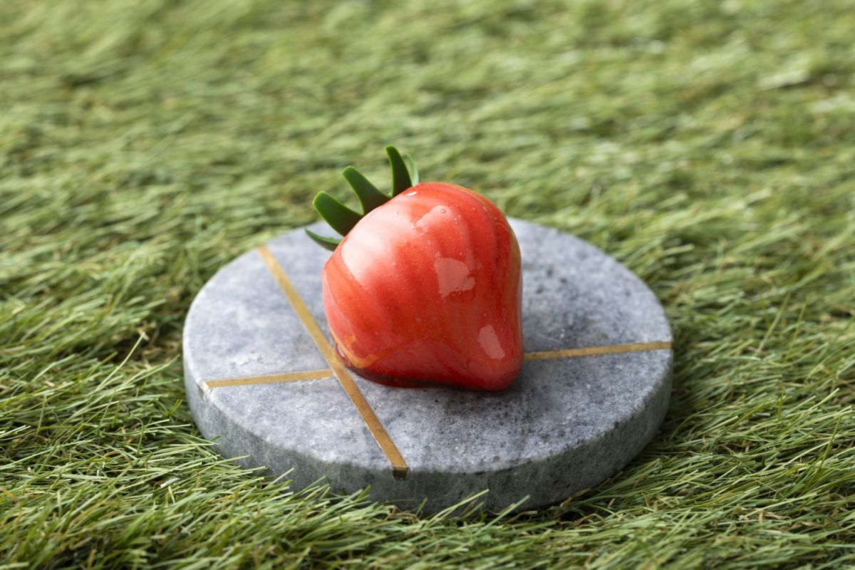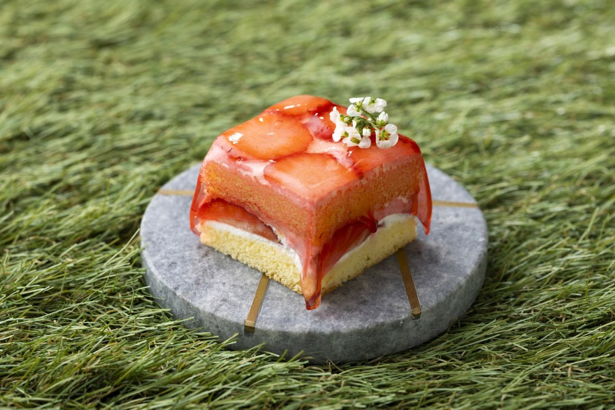 こんがりと炙ったバニラ風味のギモーブ、甘酸っぱいイチゴのパート・ド・フリュイを、イチゴビスケットでサンドしたかわいらしいスイーツです。