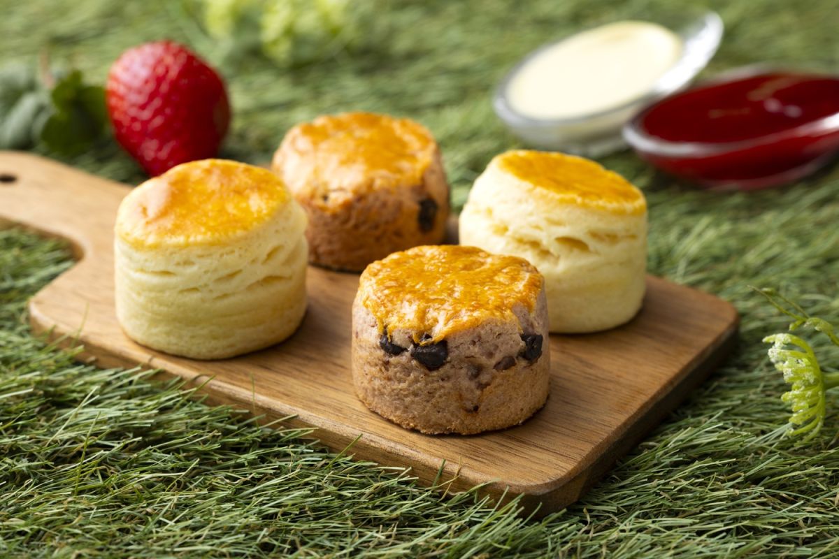 イチゴ味の生地にチョコチップをたっぷり混ぜ込んだスコーンと、発酵バターが香るクラシックなプレーンスコーンの2種を用意。お好みのティーとともに、しっとりとした焼きたての味わいを堪能できます!