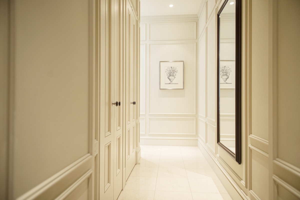 今回は、2024号室の「JADE」のお部屋をご紹介します。 客室のドアを開けると、廊下の造りからクラシックの魅力にときめきます。ホワイトで統一したシンプルなデザインながらも、モールディングの装飾が美しいアクセントに。左にある扉はクローゼットとミニバーになっています。