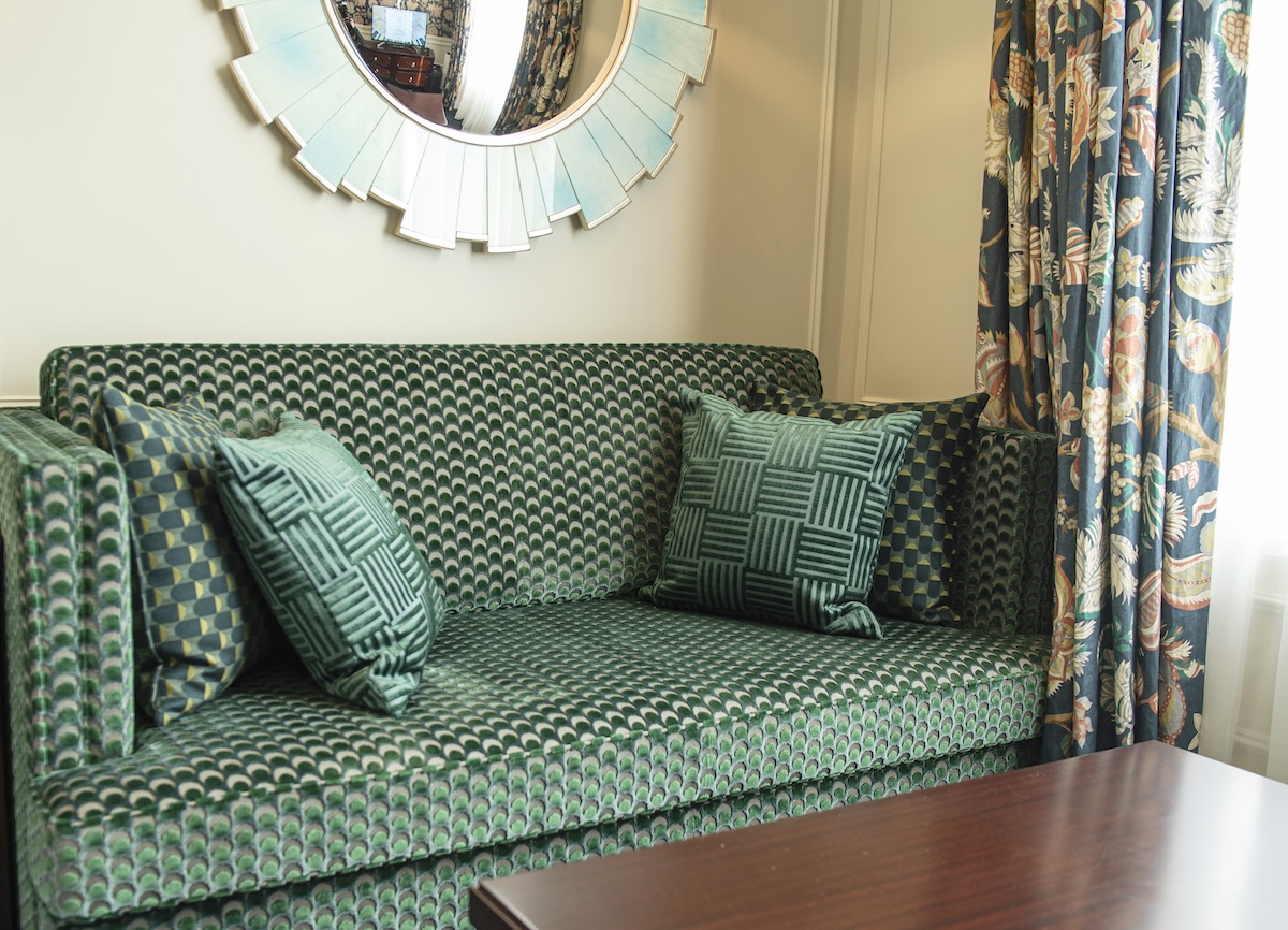 「オットマンスポット」柄のソファは特注品! 柄はジャポニズムに影響を受けた貝殻のような曲線がモチーフです。その柄にぴったりのクッションは、日本の帯やアンティーク着物の裏地にインスパイアされた「オビ チェック」と幾何学模様の「アーカイブ ジオ」。柄同士を組み合わせたり、わずかに違う色の同系色でまとめたりしていて、コーディネートに技を感じます。 ベルベットの手触りもよく、高級感と心地よさを兼ね備えたソファにうっとり。