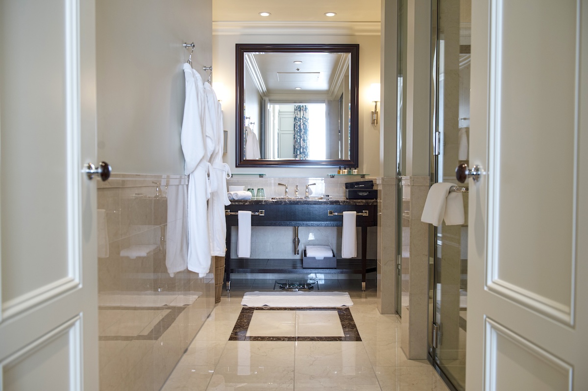 「東京ステーションホテル」の客室でさらに特筆すべきはこのバスルーム。 白いドアを開けると、正面に洗面台、右にバスルームとトイレがあります。マーブル柄のタイル、縁付きの鏡、高級感のあるデザインの洗面台まで、ひとつひとつが丁寧に選ばれたアイテムで構成されていて、ヨーロピアンクラシックを感じる上質な空間が完成しています。