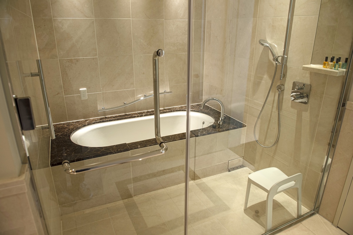 バスルームだけでもこの広さ。造り付けの大きなバスタブに、同じくらいの広さの洗い場があり、東京駅舎を使った客室のなかにこれほどの広さのバスルームがあるのかと驚くほどのぜいたく感。普段よりゆっくりとバスタイムを楽しみたくなります。