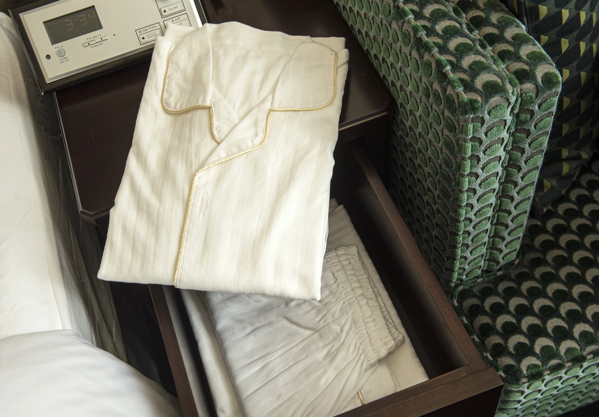 お風呂上がりに羽織るバスローブに加え、ベッドサイドの引き出しにはパジャマも入っています。柔らかいリネンのパジャマは、トップスがワンピースくらいの長さで、さらにパンツも付いています。