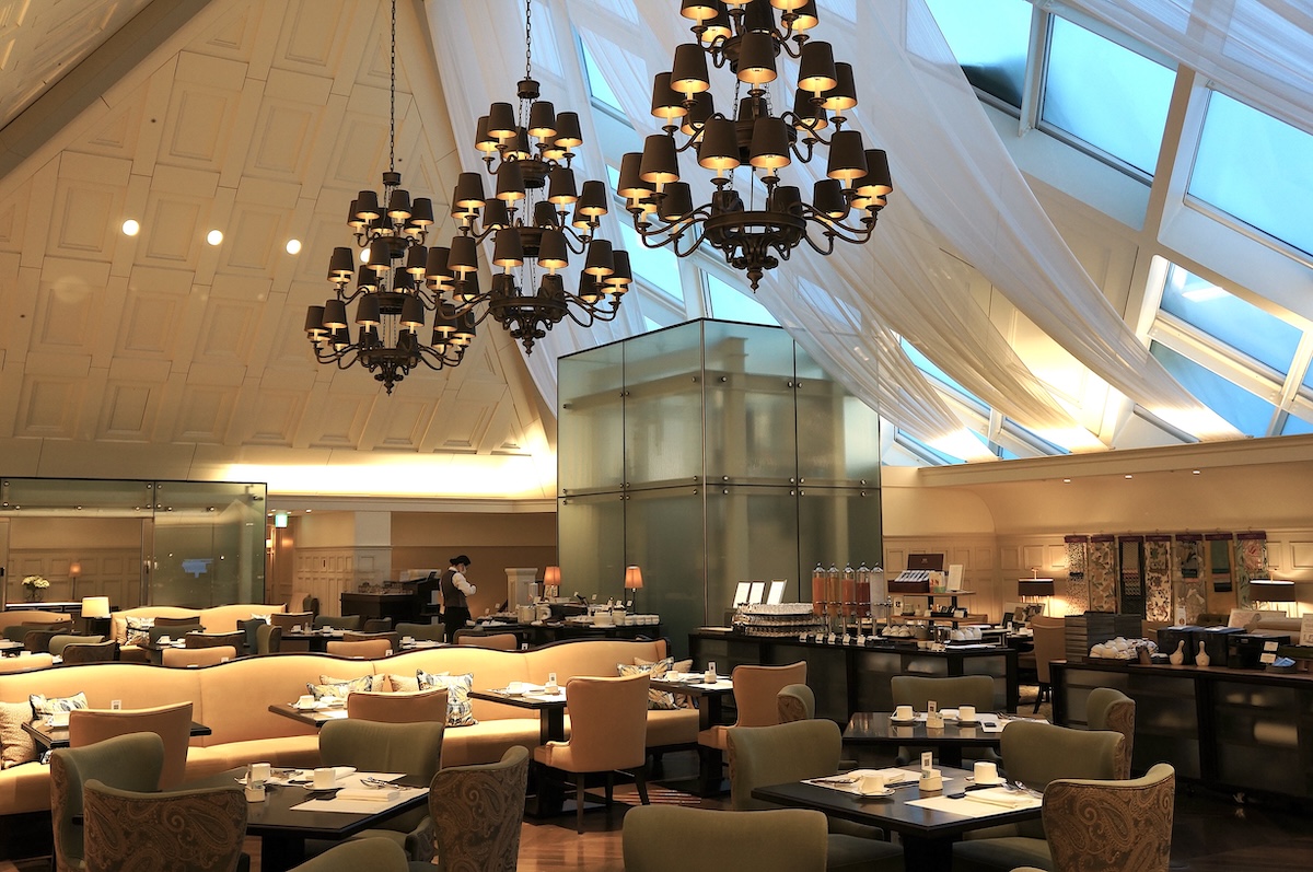 朝食会場は、丸の内駅舎の復原時に中央屋根裏の空間を利用して誕生したレストラン「アトリウム」。天井から下がる大きなシャンデリアが格調高く優雅な雰囲気を演出しています。約9mある天井の高さを生かしたこの大空間は、多くの人で混雑する朝食時間でもその密度を感じさせないゆとりを与えてくれます。