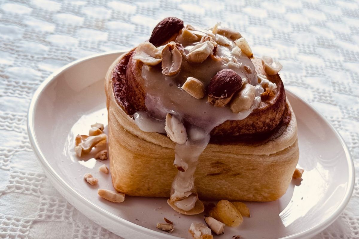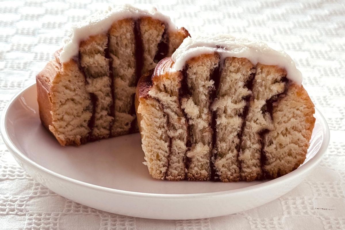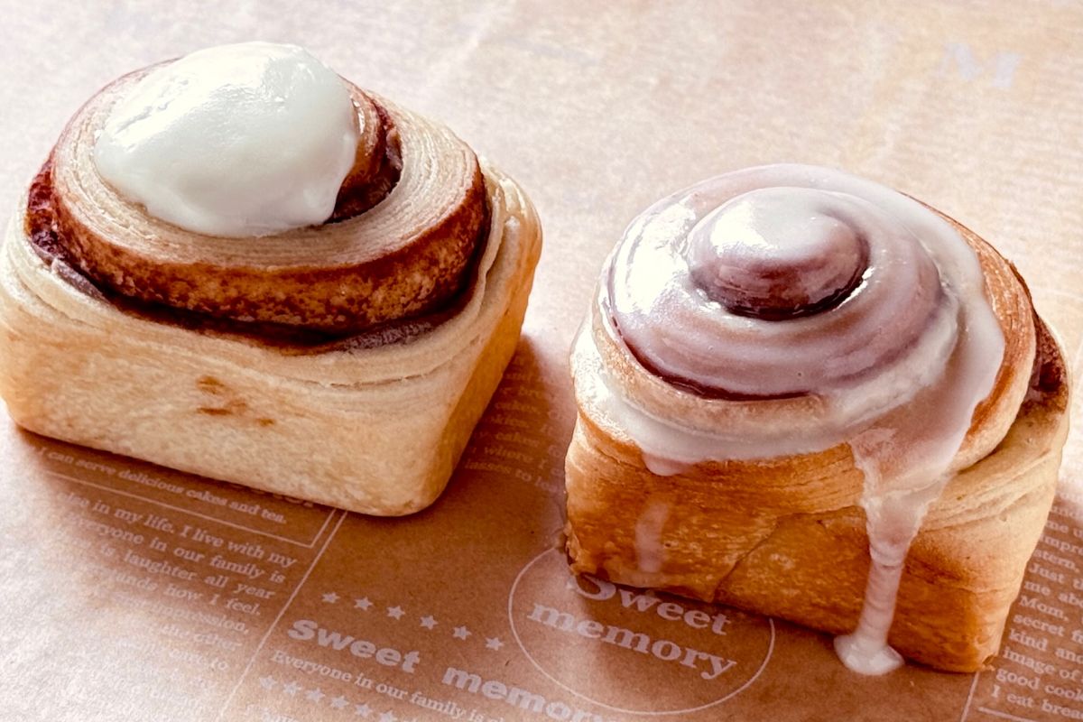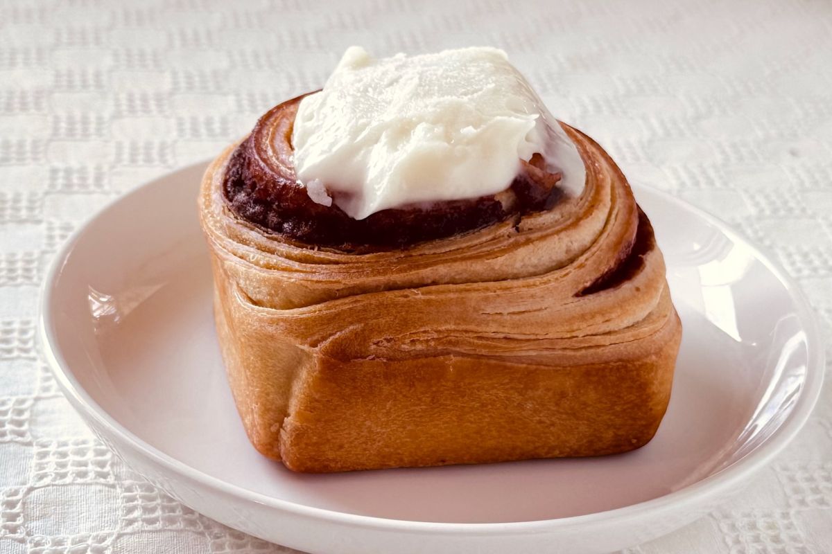 トップに白いアイシング(チーズフロスティング)がのったシナモンロール。