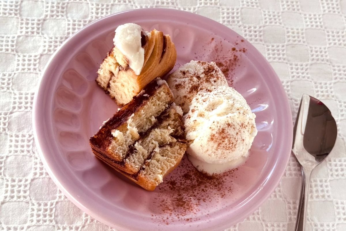 シナモンロールを電子レンジで軽く温めておくと、ホットなシナモンロールと、冷たいバニラアイスのコンビネーションが楽しめます。