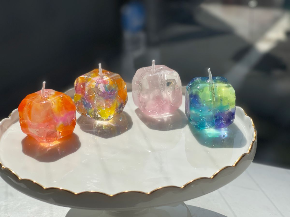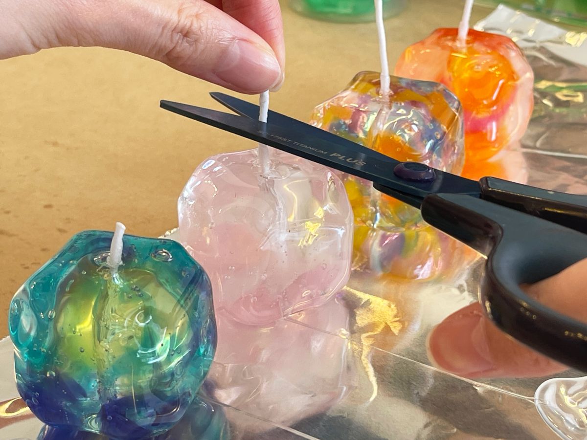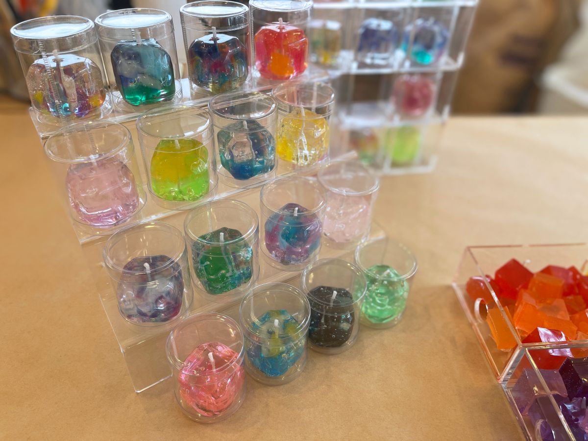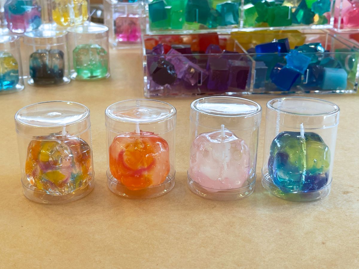 なかでも人気なのが、「ジェルジェムストーンキャンドル」というまるで宝石のようなキャンドルを一度に4つ製作できるコース。キラキラ感がとてもかわいいうえ、失敗しにくく初心者にもおすすめなのだそう。