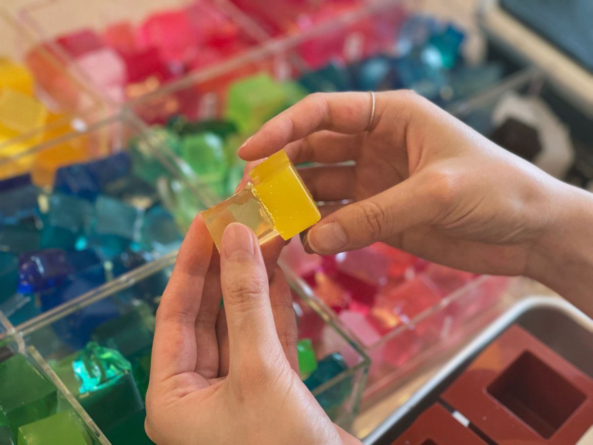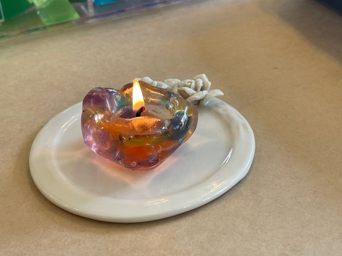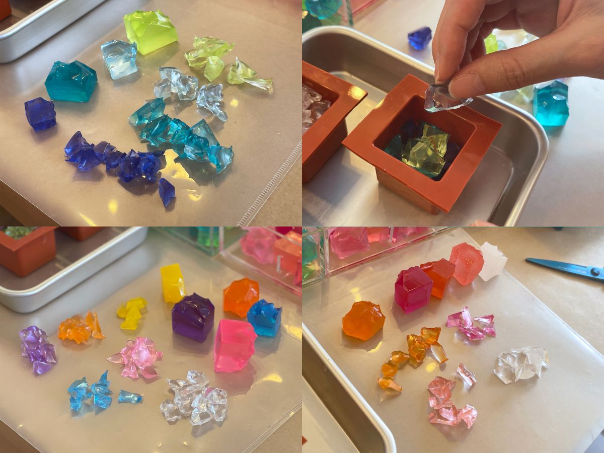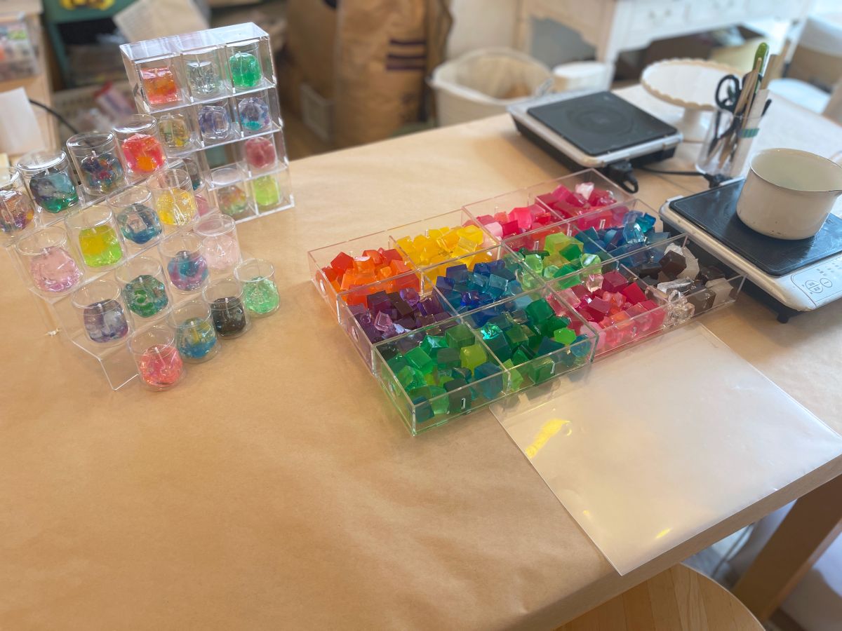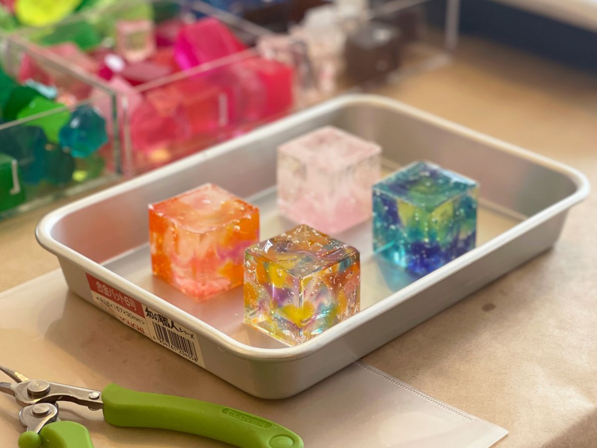 なかでも人気なのが、「ジェルジェムストーンキャンドル」というまるで宝石のようなキャンドルを一度に4つ製作できるコース。キラキラ感がとてもかわいいうえ、失敗しにくく初心者にもおすすめなのだそう。
