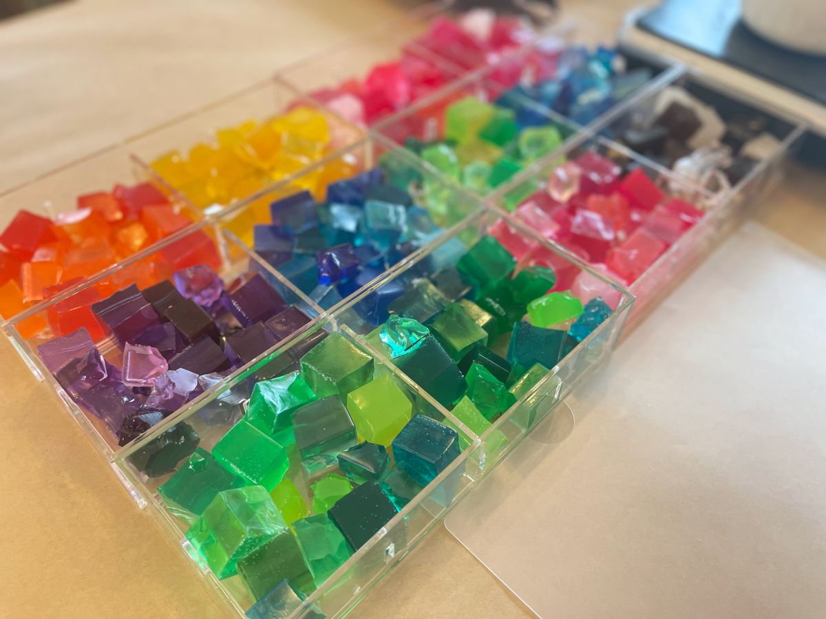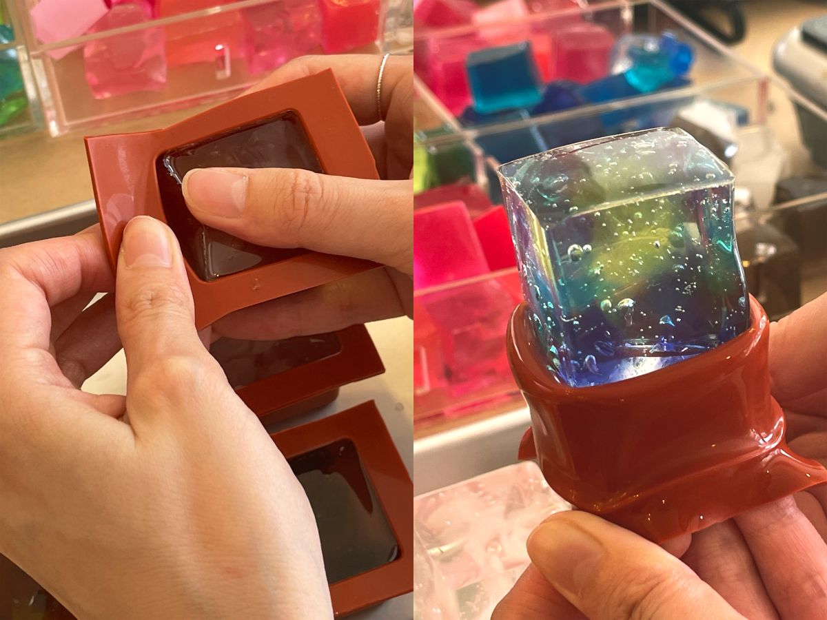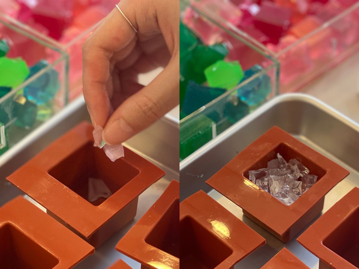 ワックスを切り終えたら型に投入。このとき、作りたいデザインに合わせてグラデーションをつけたり、色がバラけるようにしたりと調整をしながら入れていきます。型の中がどうなっているか全体像が見えないから難しさもありますが、想像をふくらませながらの作業は楽しい!