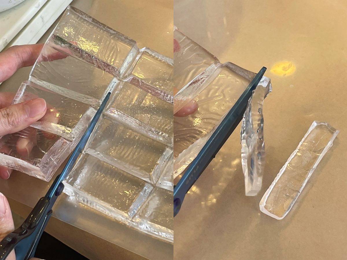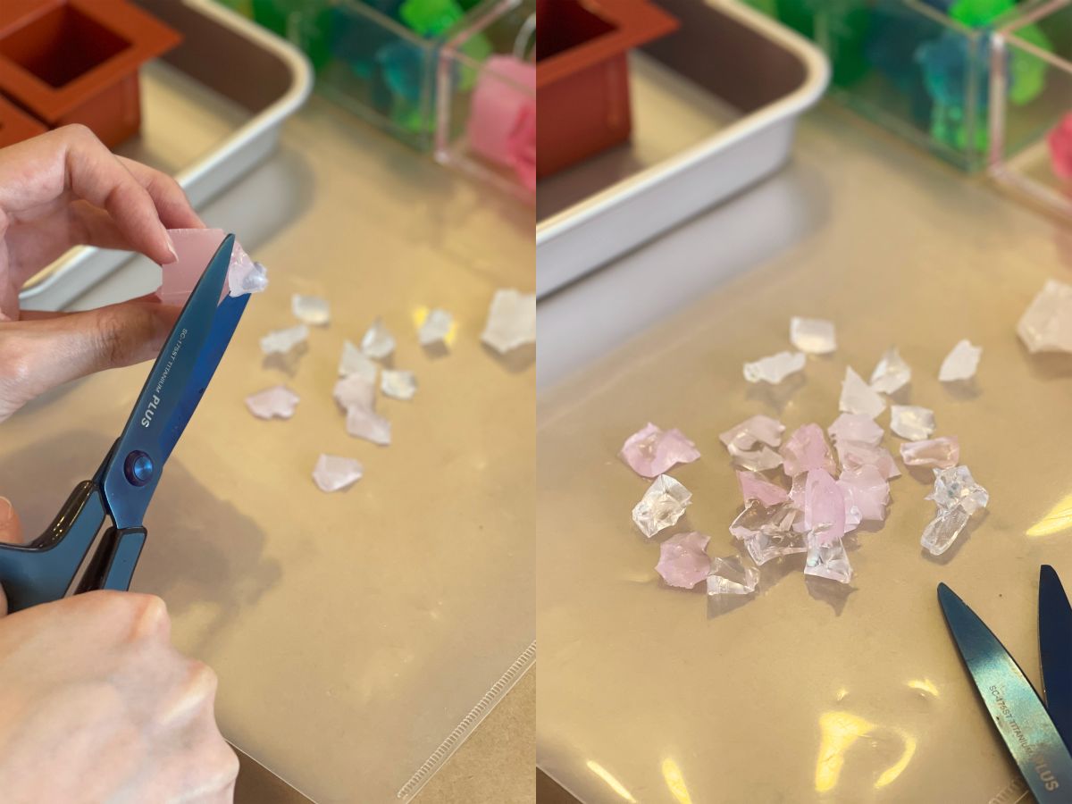 デザインを決めたら、必要な色のワックスをざっくりとカットしていきます。ぷるぷるした質感だから刃が滑りやすいけど、角を落とすようにしていくと切りやすい!