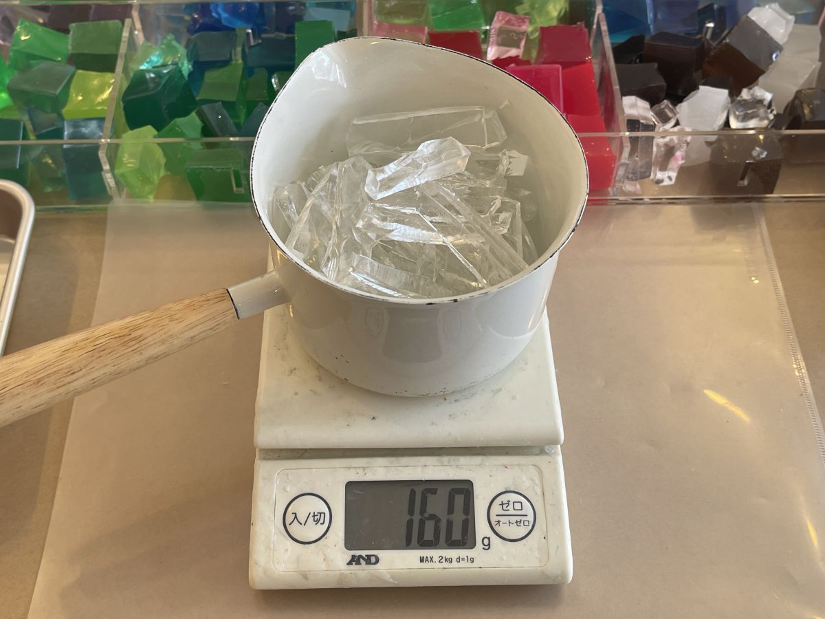 次に使うのはクリアなジェルワックス。熱して液状にするため、バレンタインのチョコレートを溶かす準備のような要領で、板状のものを細切りにします。