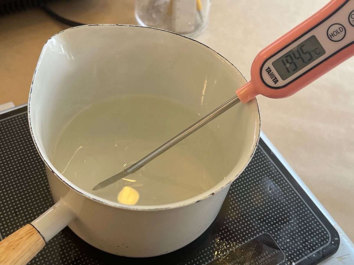 さらに加熱を続けると水と同じくらいサラサラに! 約200度になるまで熱します。