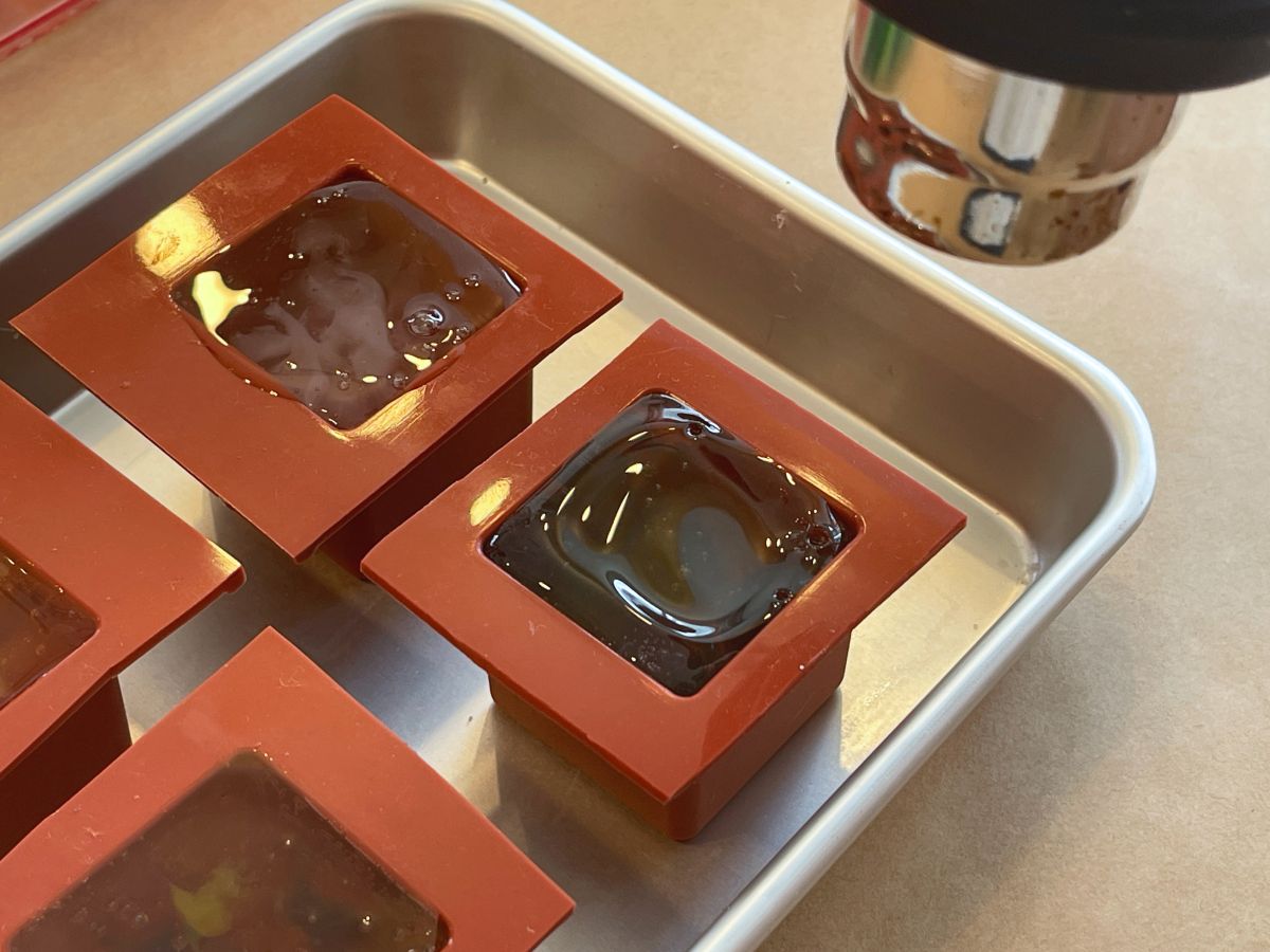 5分経ったら冷凍庫から取り出して、型から外します。4辺をそれぞれ引っ張って剥がしたら、ぷるんと剥くように! まだ中心は柔らかい状態なので力を入れすぎないように注意して。