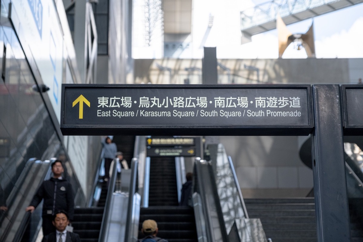写真のように京都タワーを背にして京都駅の正面に向かうと、写真右(西側)には、には、大階段や南北自由通路、ジェイアール京都伊勢丹があります。一方、写真左(東側)にあるのはホテルグランヴィア京都や京都劇場。多くの人は買い物や移動のしやすさから、どうしても右側(西側)に向かいがち。でもだからこそ、左側(東側)はちょっとした“穴場”なんです。