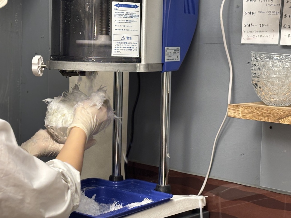 使っている氷は、鈴鹿山系の地下150mから組み上げた天然水を72時間かけてゆっくりと凍らせた純氷。氷の状態によって細かく刃の角度を調整できる「初雪」の氷削機を使って、羽衣のように薄く削ります。