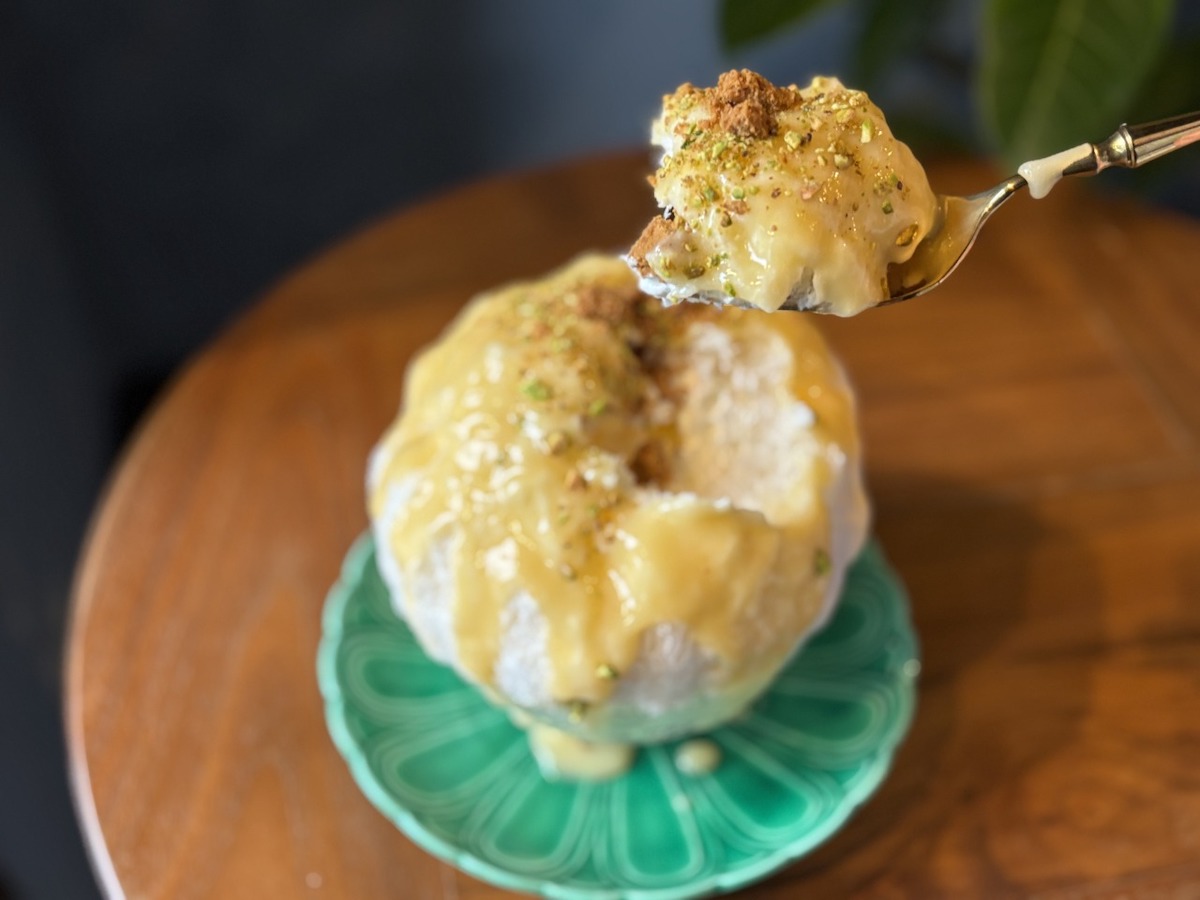 砕いたピスタチオとシナモンビスケットが味のアクセント。レモンの甘酸っぱさを極めたかき氷ですが、最後にミルクのやさしい甘さとつるんとした食感のパンナコッタが現れ、舌をやわらかく包み込みます。1杯のかき氷の中にストーリーがあって、大満足。