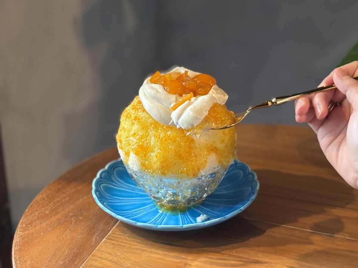 京都ならではのかき氷としてご紹介したいのは「山粧う金柑(やまよそおうきんかん)」。「山粧う」は秋の季語。山の木々が紅葉で色づき、まるでお化粧したような姿をいいますが、こちらのかき氷は天然の金柑シロップで覆われて、オレンジ色に彩られています。