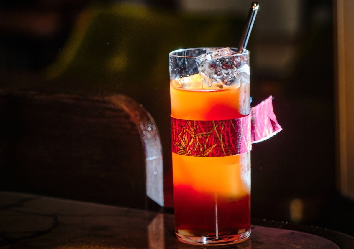 新宿の老舗百貨店「伊勢丹」は元々着物屋として創業しました。このカクテルは着物の帯から着想を得ており、グラスには帯を思わせるリボンを巻いています。