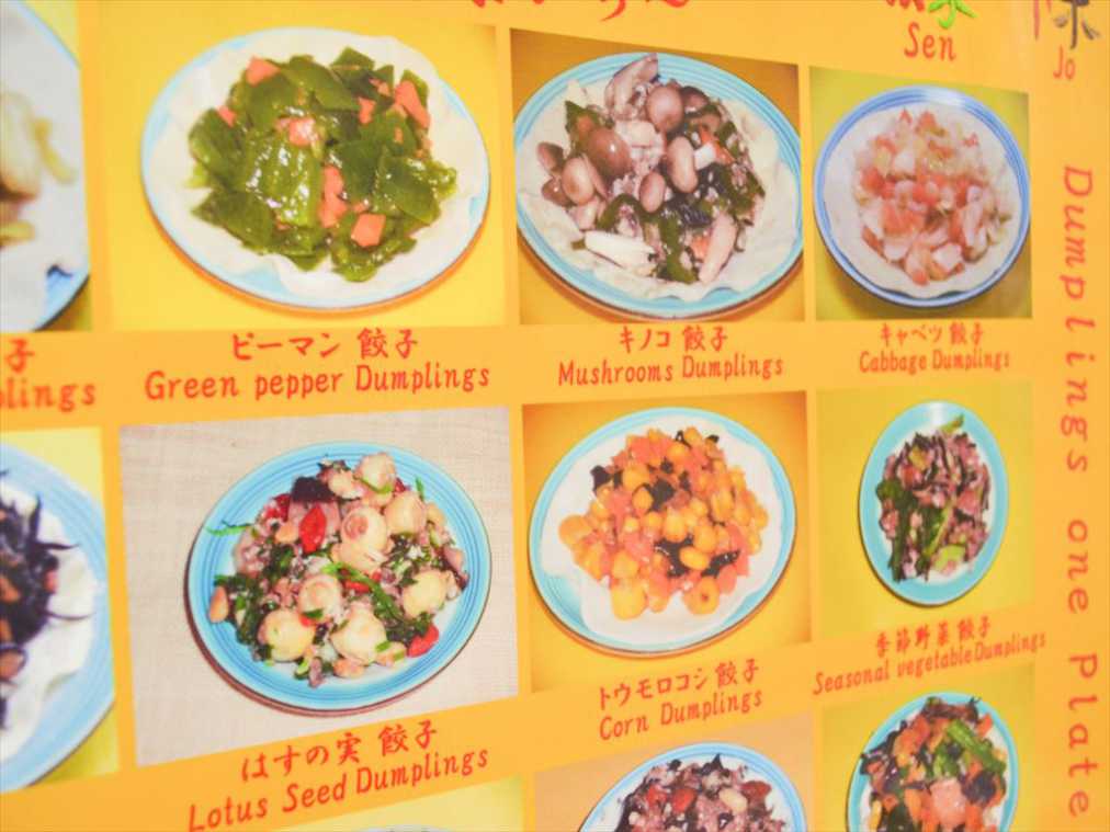 餃子の餡も皮の色に合わせてそれぞれ違う食材が使われているというこだわりよう。旬の食材がふんだんに使用されています。店内に貼られた黄色地のメニューには、餃子の餡の具材を写真でわかりやすく解説してくれていますよ。