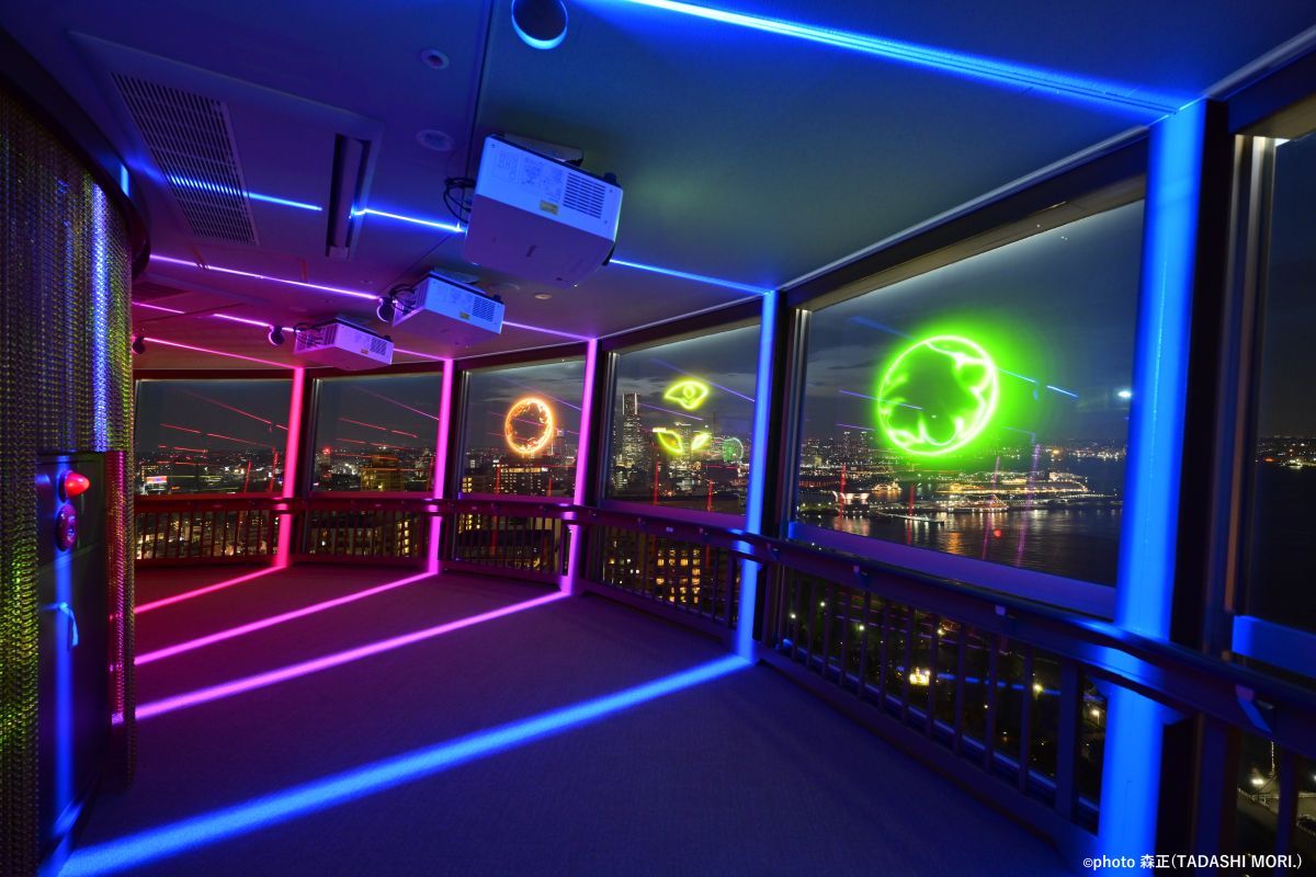 30階は、360度ぐるりと景色を眺めることができる回廊式の展望フロア。18時になると横浜の夜景に映像を重ね合わせたメディアアートギャラリーに変身。展望台の窓ガラスに投影された映像と横浜の夜景がコラボレーションして、幻想的な空間を作り出します。