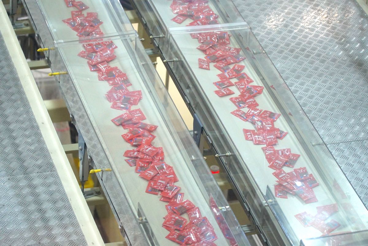 映像や展示を通して、森永製菓の歴史やお菓子を学んだあとは、徒歩数分の工場で「小枝」「ハイチュウミニ」の製造ラインが窓越しに見学可能。「小枝」が製造、包装されラインを流れていく様子に思わずワクワク。製造工程の映像やラインのライブ映像を見ることができます。