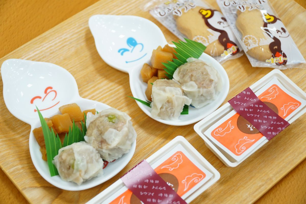 そして最後はシウマイの試食体験へ。試食はシウマイ2種とシウマイ弁当のおかずのなかでも不動の人気を誇る「筍煮」、「横濱ひょうちゃんサブレ ~金ごま~」のセット(写真は2名分)。 シウマイはできたてで温かく、実際につくられている現場を見学した後だとおいしさもひとしお。